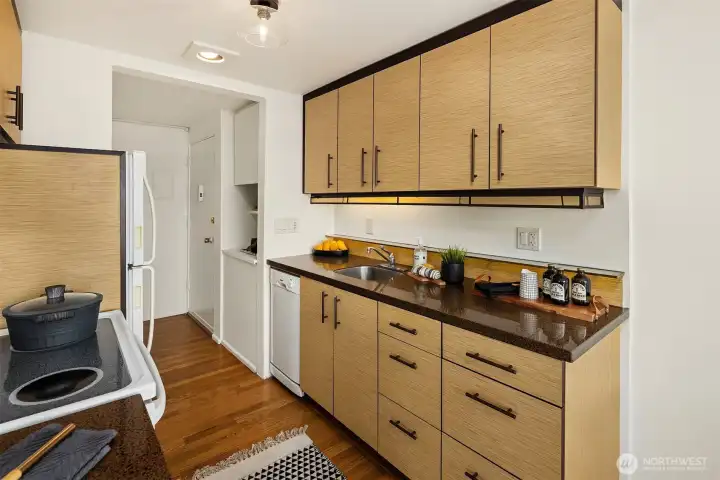 Kitchen detail — updated cabinetry with textured fronts, dark countertops, stainless sink, dishwasher, and full-size refrigerator. The galley layout is efficient and well-organized, with generous upper and lower cabinet storage throughout.