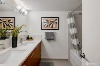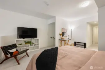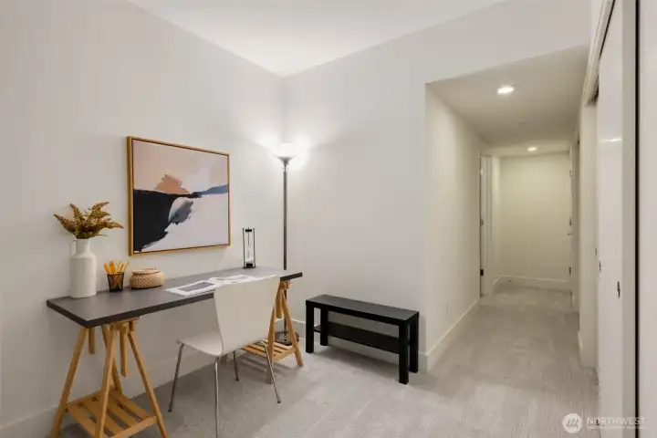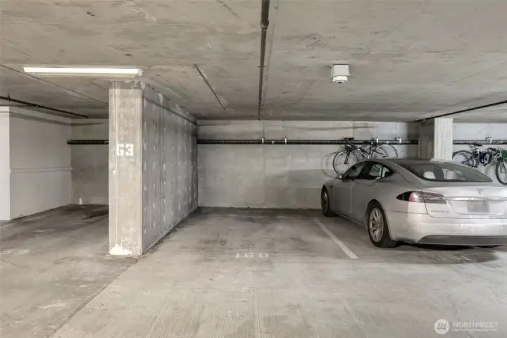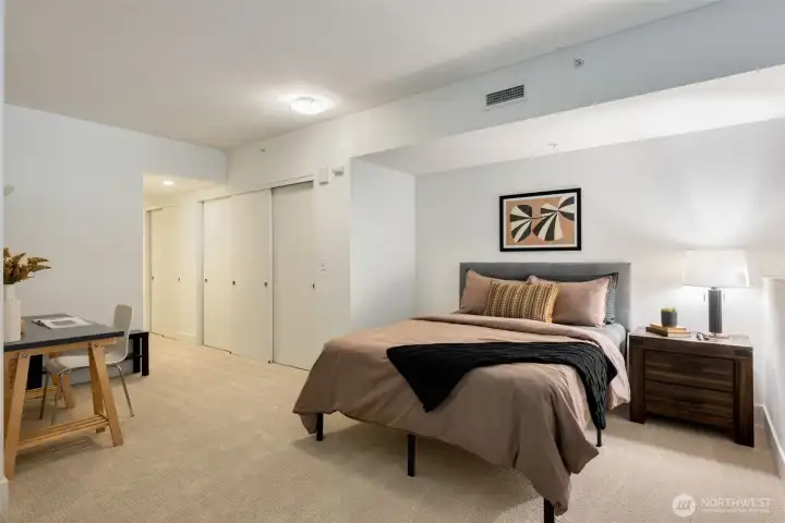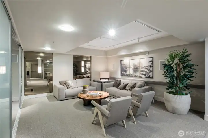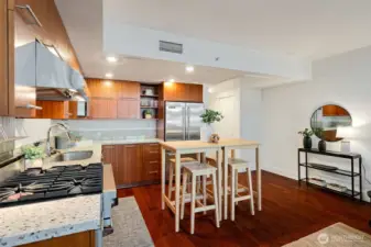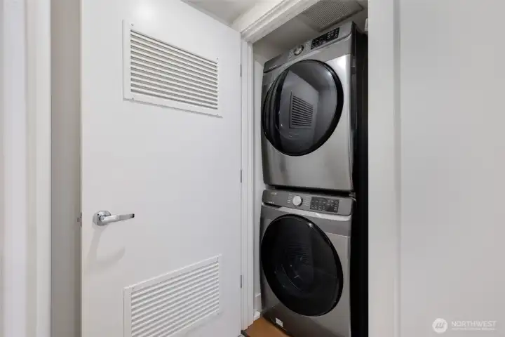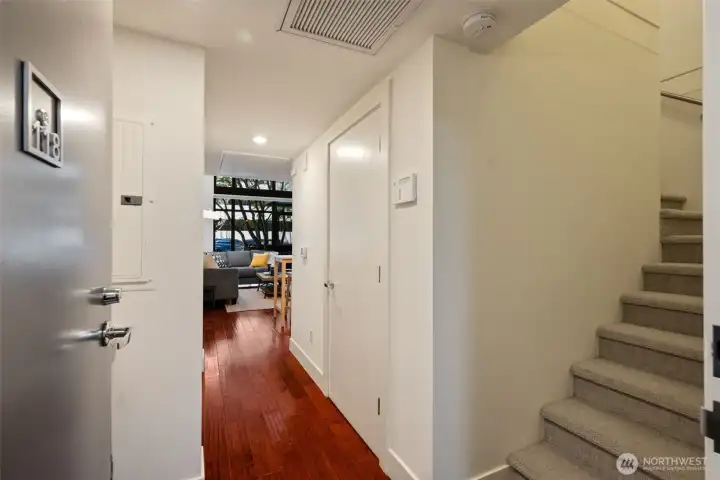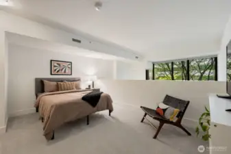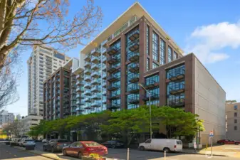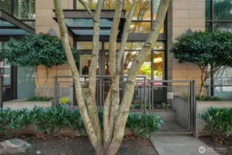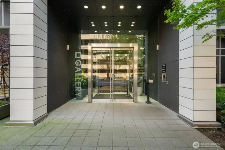Luxury loft at Gallery Condominiums in Belltown. Only one of four Live/Work opportunities in this amenity rich community perfectly positioned near Seattle’s iconic landmarks. Convenience and quality shine with a double height window wall and two entrances into this spacious two level open living layout. Street level entry with a gated patio surrounded by lush foliage. Soaring ceiling height and a dramatic window wall show off this impeccably maintained one bedroom loft with motorized shades, hard surface flooring on the main level and A/C throughout. Large open kitchen with tons of cabinet storage, slab counters, Viking appliances and room for a prep island and eating bar are the backbone of this gracious living space. Entertain, relax, work from home, do it all in this flexible floorplan with a convenient half bath and interior entry on the main level too. Upstairs lofted bedroom has plenty of space for a king size bed and desk, double closets, w/d, and an ensuite double vanity bath. Garage parking and storage included. Gallery offers first class amenities that include 24/7 concierge, rooftop decks, owner’s lounge, fitness center, fido washing/relief zone and 2 guest suites. Ideally located near the new Waterfront Park, Sculpture Garden, Pike Place Market, Space Needle, Climate Pledge Arena; with tons of food, drink and services at your doorstep.