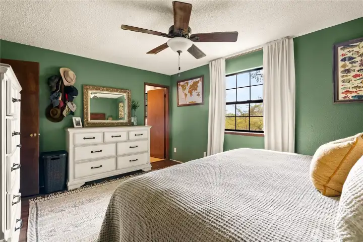 Primary bedroom with ceiling fan.