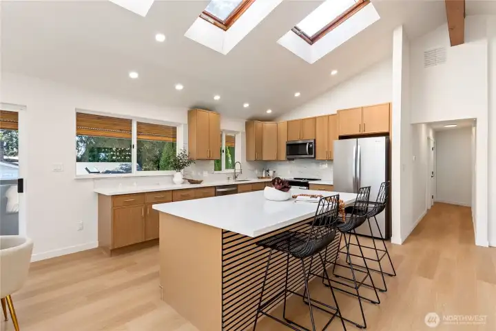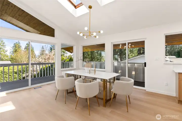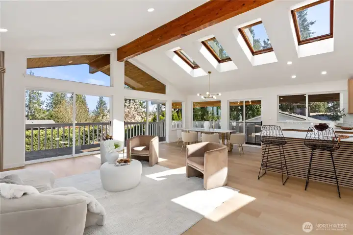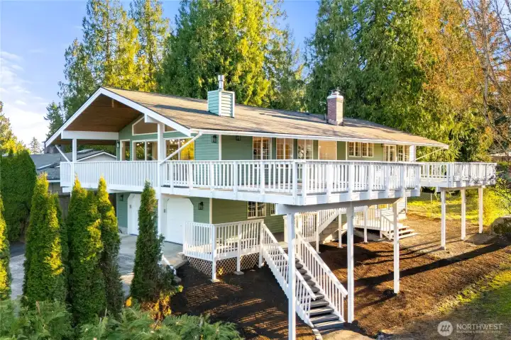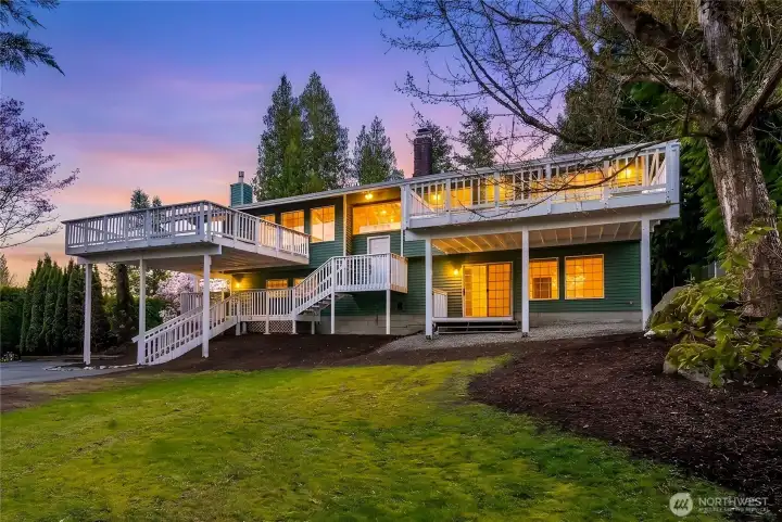 Absolutely breathtaking luxury residence in Snohomish’s coveted Kenwanda neighborhood,ideally located near the picturesque Snohomish River Valley.This exceptional home offers an elevated Northwest lifestyle with 2 expansive decks and a stunning wraparound deck, perfectly designed for entertaining, relaxing, and enjoying partial views of majestic Mount Baker and the surrounding natural beauty. A grand,wide staircase creates a striking first impression,leading to an upper level defined by soaring vaulted ceilings & a dramatic open-concept layout.Skylights and expansive windows flood the home with natural light, highlighting the refined living spaces & a custom-designed electric fireplace that serves as a sophisticated focal point.The designer chef’s kitchen is a true showpiece, featuring a generous island, custom backsplash, sleek cabinetry, & stainless steel appliances—crafted for both everyday living and elevated entertaining.The lower level provides a spacious,oversized family room,a well-appointed laundry room,&a stylish powder bath, offering both comfort and functionality. Upstairs, the luxurious primary suite is a private retreat with vaulted ceilings, abundant natural light, a walk-in closet, and exclusive access to a private deck.The spa-inspired ensuite bath showcases a custom shower and dual vanity. Two additional well-sized bedrooms complete the upper level.A rare opportunity to own a refined, light-filled home blending modern elegance with timeless comfort.Must SEE!