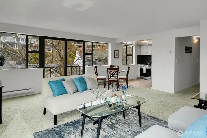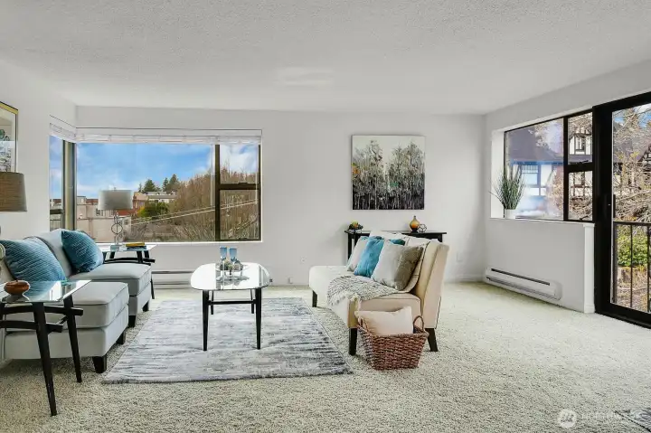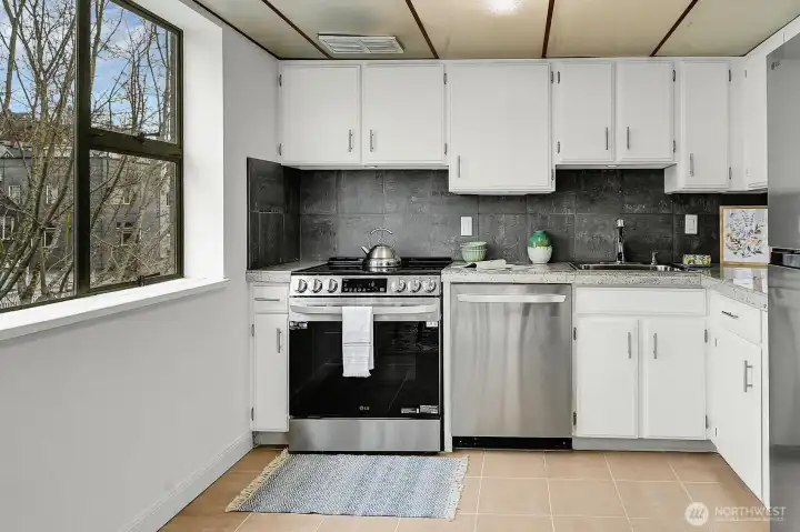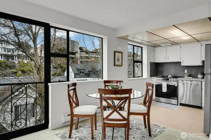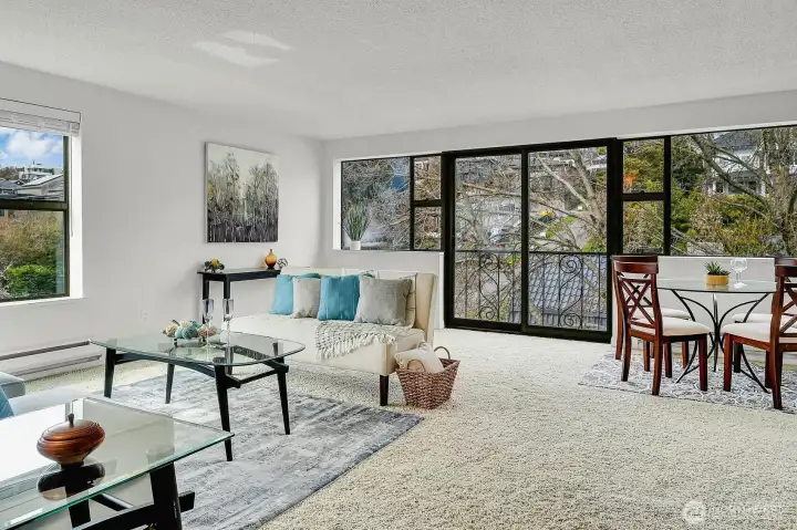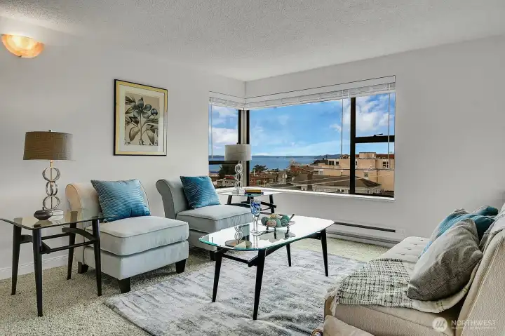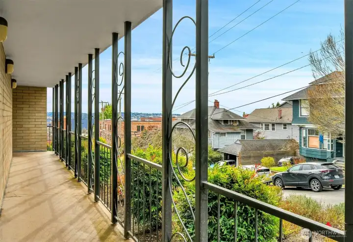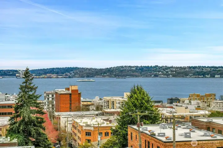 Amazing light filled, top floor 2 bedroom, 1.75 bath corner unit at the Hill House on Queen Anne's south slope features dazzling expansive views of Elliott Bay, Puget Sound & beyond! Features include windows on 3 sides for maximum natural light, a great floor plan for easy living & entertaining, all new stainless steel appliances, new counters/sinks in both bathrooms, fresh paint throughout, plus abundant storage & closets. 1 deeded parking space is included. 4 Guest Parking Spaces! Lovely outdoor common area garden space! Convenient location is close to restaurants, shopping, transportation, parks, waterfront, downtown, South Lake Union, Amazon, plus more!