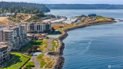Condo lifestyle awaits with center stage views of MT RAINER and COMMENCEMENT BAY in Pt. Ruston’s Rainier Building. Over 1500 Square feet of space and an EXTRA-LARGE DECK [465 SF] for carefree living. 2 Bedroom PLUS DEN floor plan. Open concept kitchen w/ quartz counters; stainless Bosch appliance package and breakfast bar to the open living/dining room with HARDWOODS and tiled fireplace. Full-width windows take in massive VIEWS; nearby PRIMARY SUITE is view side w/ deck access; ensuite bath w/ makeup desk; heated floors; walk-in closet; dual vanity and water closet. The second bedroom is also an ensuite to the full guest bath. Utility room w/ sink, storage, and includes washer/dryer. OFFICE/DEN tucked away for quiet time. Added perks of AIR CONDITIONING; 8 ft doors; upgraded flooring; coffered ceilings, and ZERO STEPS to entry; 2 parking spaces on the SAME FLOOR of the home. Ruston is a vibrant community and delivers the ultimate backdrop of festivals, fireworks and incredible lifestyle. You deserve to live the way your life was meant to be.
