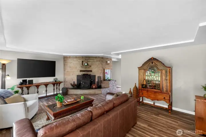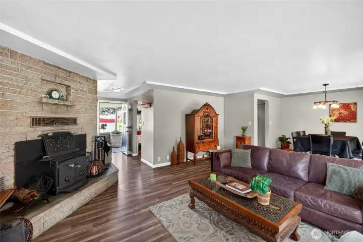 The brick fireplace is the showstopper of this room! A wood burning insert has been added- lots of warnth and comfort on a chilly PNW evening!