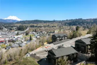Sweeping panoramic views of Mt. Rainier and sparkling Eatonville city lights greet you from every level of this brand new, never-lived-in 3-story condo in a brand-new 4-plex. This is elevated living at its finest in the gateway to Mt. Rainier National Park. The bright, light-filled main floor is perfect for entertaining, featuring tons of natural light, a huge kitchen with separate pantry, spacious dining room, and generous formal living space — all opening to dramatic mountain and city views. Exceptional upgrades include granite countertops in the kitchen and all bathrooms, custom two-tone cabinetry with a dramatic black island and crisp white upper/lower cabinets, wide white-painted trim finished on-site, and beautiful white panel doors. Luxury vinyl plank flooring covers the main floor, baths, and laundry, while plush carpet warms the rest. See photos of the condo across the street built by the same builder—it showcases many of these same high-quality finishes. The flexible floor plan offers two primary bedrooms upstairs and a third bedroom, full bath, plus bonus room downstairs. Every level captures the stunning views. Construction is 100% complete. Condo recording is near finalized, with FHA, USDA VA, and conventional financing approvals in process. Enjoy a quiet hilltop setting above the city, close to downtown Eatonville and minutes from Mt. Rainier recreation. Don’t miss this rare opportunity for affordable home ownership with luxury finishes and million-dollar views!