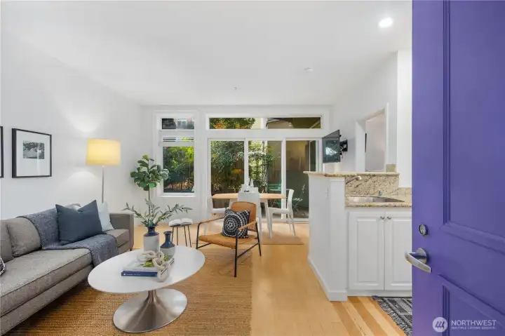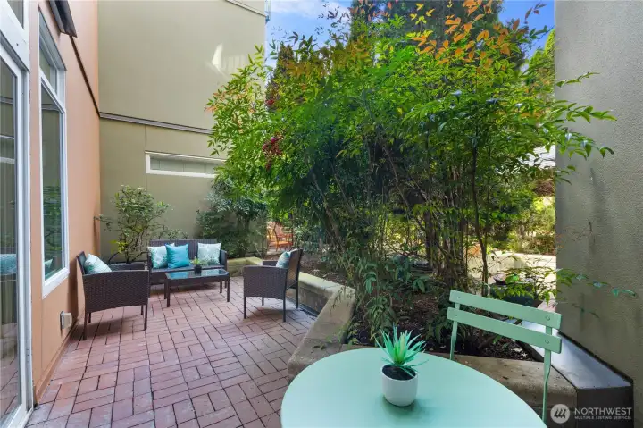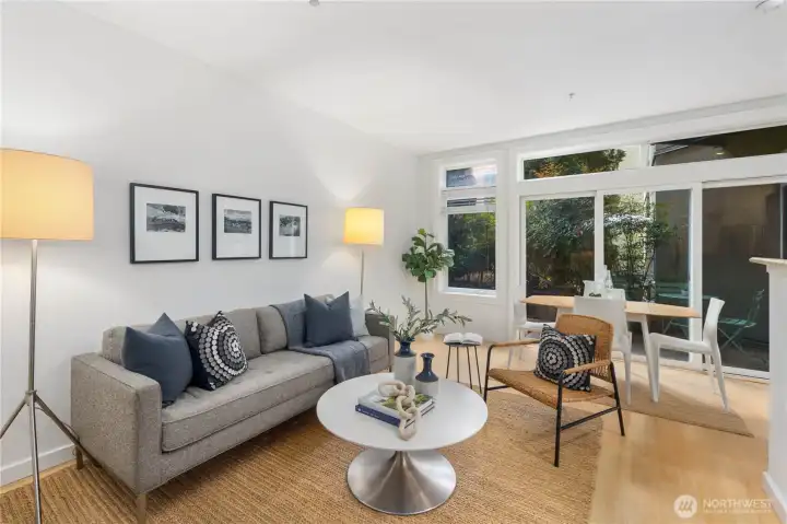 Defined by its rare connection to the outdoors, this residence offers an expansive private patio that lives as an extension of the home—ideal for dining, planting, or unwinding in a quiet courtyard setting. Inside, the layout is open and filled with natural light, with large windows and an easy flow between living and kitchen spaces. The kitchen includes an eat bar and generous cabinetry, while the bedroom is well-proportioned with ample storage. Freshly painted and move-in ready, with secure garage parking included. Residents enjoy access to a pool, spa, sauna, fitness center, and a courtyard with lush green gardens. Short-term rentals permitted. Minutes away from Pike Place Market, Seattle waterfront, Restaurants, coffee and many other amenities.