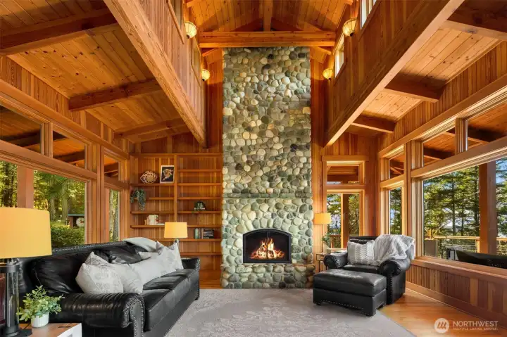 Dramatic floor-to-ceiling river rock wood-burning fireplace