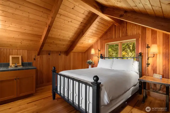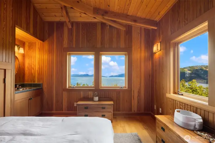 Main floor primary bedroom with vaulted ceilings and views straight through to Canada.