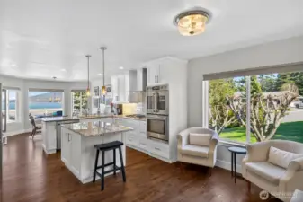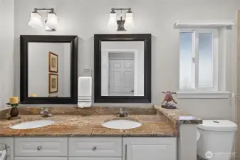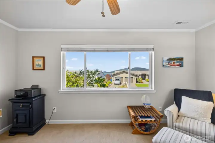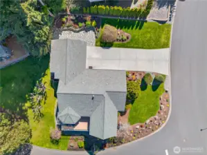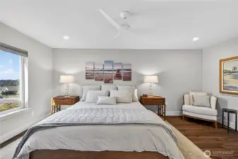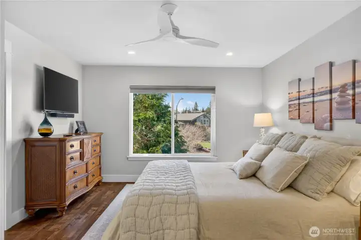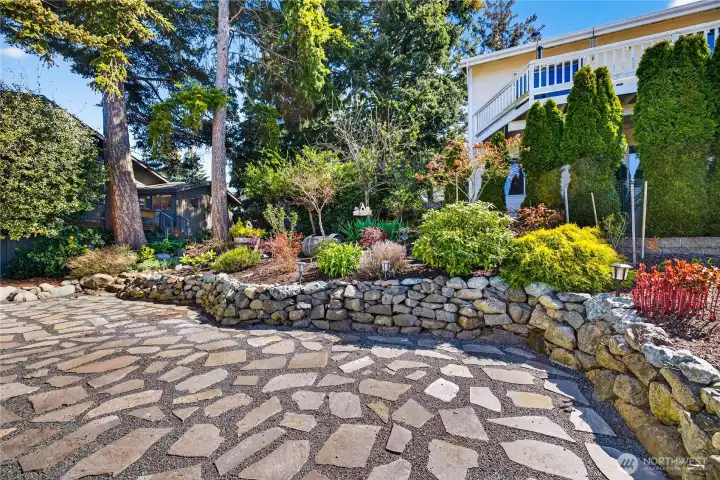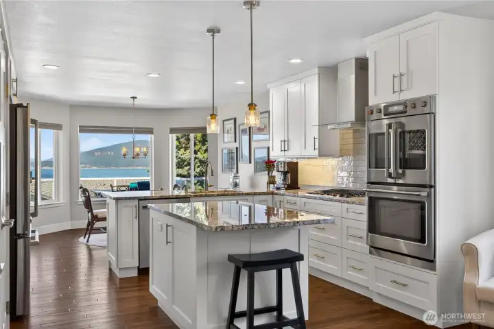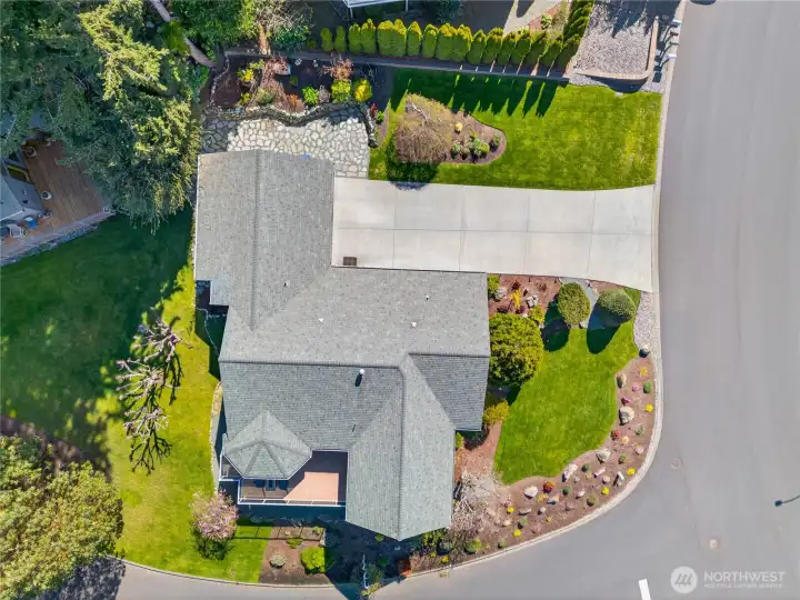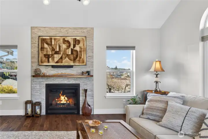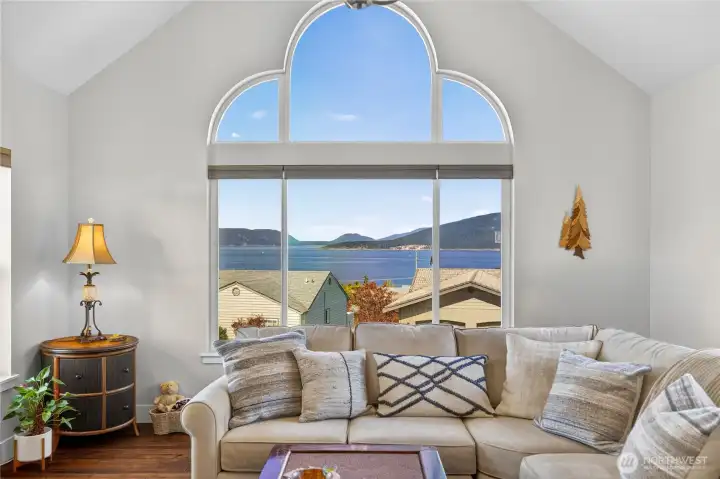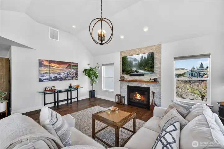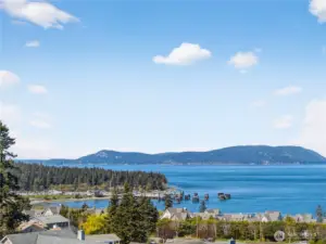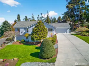 Perched on a beautifully landscaped corner lot, this light-filled home captures sweeping water, island, and mountain views that define the Pacific Northwest lifestyle. Step inside to an inviting open-concept layout where rich hardwood floors, vaulted ceilings, and a stunning stone fireplace create a warm, elevated living space designed for both everyday comfort and effortless entertaining. The chef-inspired kitchen features expansive granite countertops, crisp white cabinetry, stainless steel appliances, and a generous island that flows seamlessly into the dining and living areas. Large windows frame breathtaking views, bringing natural beauty indoors. Unwind in the spa-like primary suite with a luxurious walk-in tile shower and serene soaking tub, thoughtfully designed for relaxation. Outdoor living shines with an expansive view deck—perfect for morning coffee or sunset gatherings—overlooking the water and surrounding neighborhood. The meticulously maintained grounds offer striking curb appeal with curated landscaping, stone pathways, and vibrant plantings. A spacious garage and additional parking provide flexibility, while nearby community amenities, including sports courts, enhance an active lifestyle. This is more than a home—it’s a front-row seat to the lifestyle you’ve been waiting for.