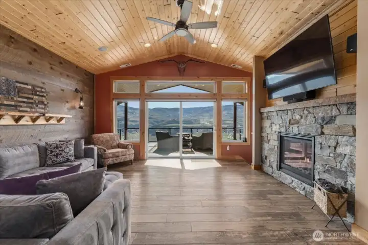 Great room features a stone surround Heat & Glo fireplace, vaulted pine ceilings, surround sound and Milgard windows and double glass sliding doors leading out to the spacious deck overlooking the Columbia River.