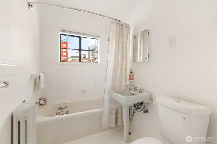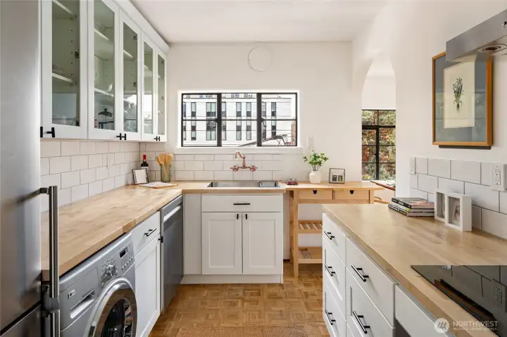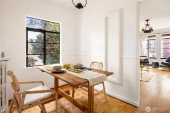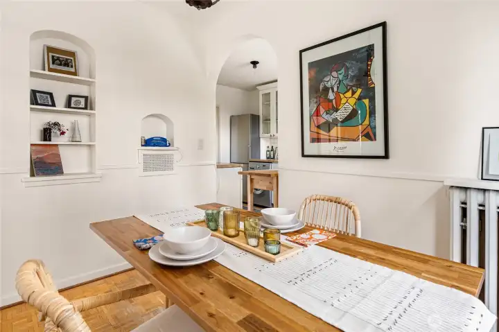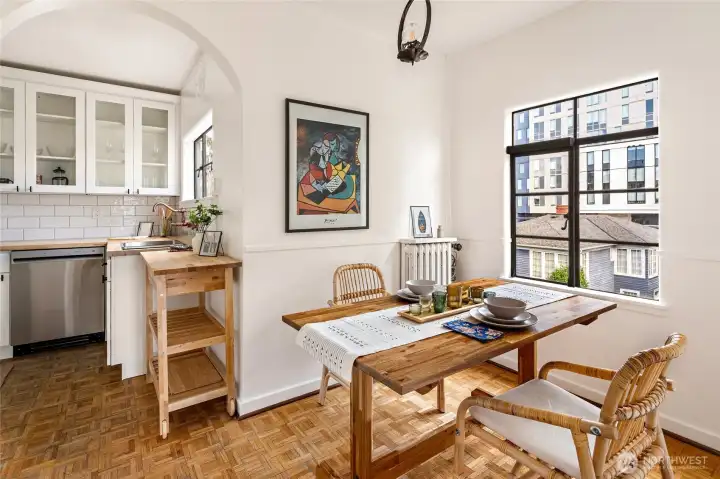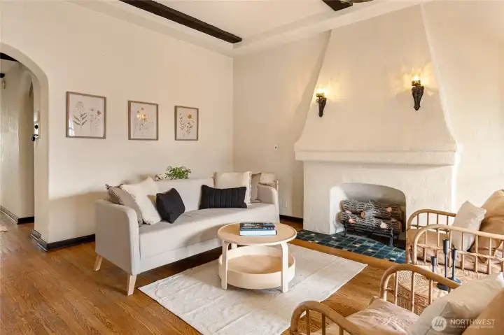 Step into the romance of Spanish Colonial Revival design in this top-floor, end unit, where historic detail meets everyday ease. Sunlight pours into the inviting living room, anchored by a beautiful fireplace, while coved ceilings and archways create a sense of timeless elegance. The updated kitchen honors the home’s character, and a flexible front room adapts to your lifestyle—office, dining, or guest space. Tucked away, the rear bedroom offers peaceful privacy. With garden surroundings, a quiet top-floor setting, and a rare small car garage, this home is both inspiring and livable—just as it has been for generations of artists and writers.