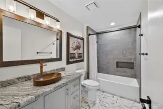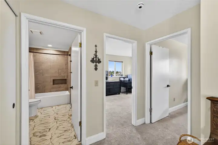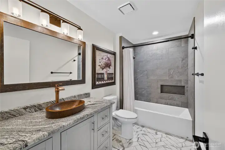 Charming Home on a Quiet Cul-de-Sac with Outdoor Retreat. This beautifully maintained home, nestled on a peaceful cul-de-sac, offers the perfect balance of comfort, style, and outdoor recreation. Step into a private backyard oasis, ideal for entertaining or relaxing, featuring a hot tub, fire pit, and fully fenced side yard. Nature lovers will appreciate direct access to a nearby forest trail leading to Little Cranberry Lake. Inside, the home boasts a tastefully renovated kitchen with quartz countertops, ceramic tile flooring, a built-in beverage refrigerator, and thoughtfully designed pull-out drawers maximize storage and functionality. The primary suite is a true retreat with a walk-in closet and an updated ensuite bathroom complete with radiant heated floors, dual vanities, and a walk-in shower. The secondary bathroom is equally stylish, featuring a copper sink, stone countertop, and tile flooring. Recent upgrades include new carpet, fresh interior paint (2026), and a new roof installed in July 2025. Additional highlights include an oversized two-car garage with an 8-foot door, loft, RV outlet, dedicated front RV parking, and abundant storage throughout. This move-in-ready home is perfectly suited for everyday living and outdoor adventures.