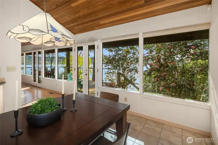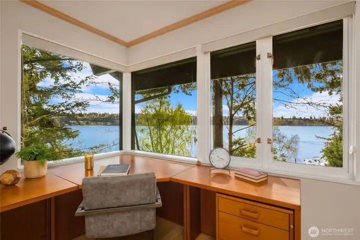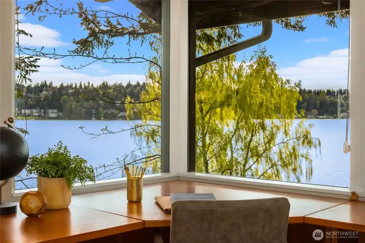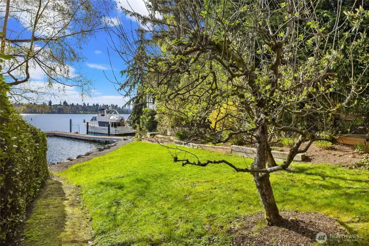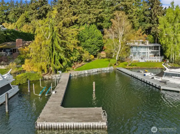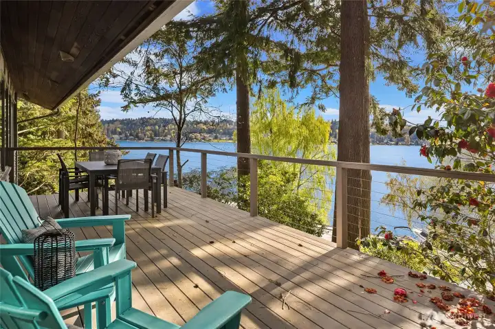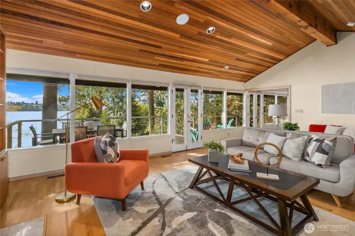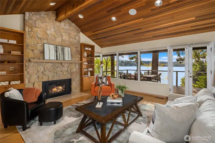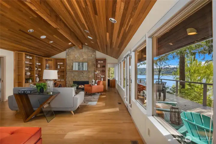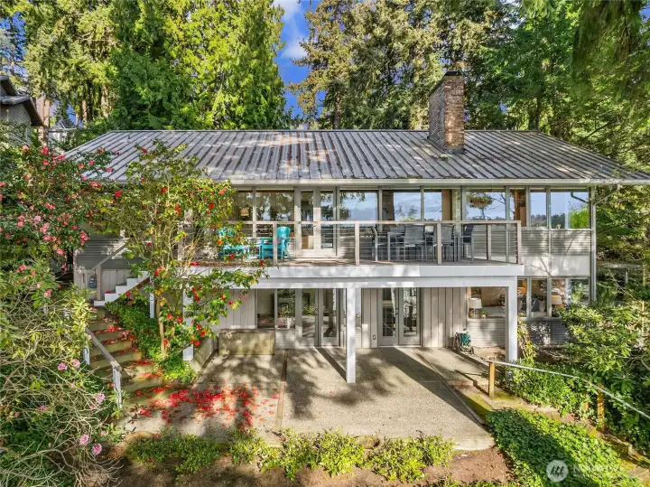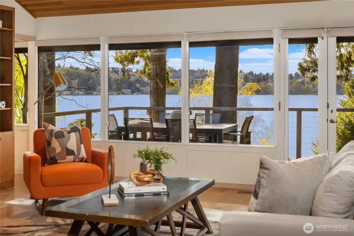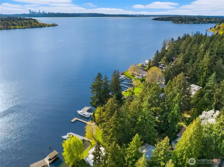 A true mid-century waterfront retreat with classic clean lines and timeless design in the heart of Enatai. Warm modern aesthetic accented throughout with vaulted cedar plank ceilings and walls of glass. Architecturally striking features include a dramatic stone fireplace and natural textures. Panoramic outlooks of the Olympic Mountains and the calm waters of Lake Washington from Mercer Island to North Seattle. The sunsets will take your breath away! This rare street-to-water lot offers 50 feet of sunny, low-bank waterfront, a grassy lawn dotted with three fruit trees, and a private dock with deep-water moorage. An opportunity to own a piece of Northwest modern design on the water’s edge.