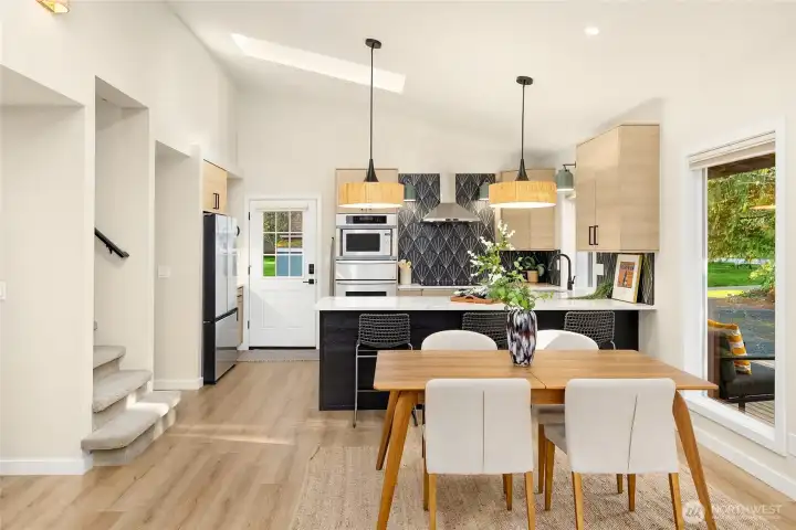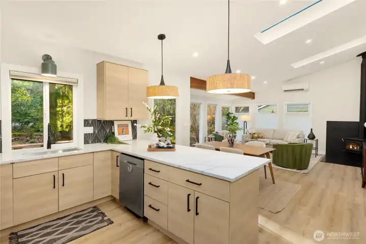 Enter into an open concept great room filled with natural light featuring exposed beams, cozy woodstove, vaulted ceilings and skylights.