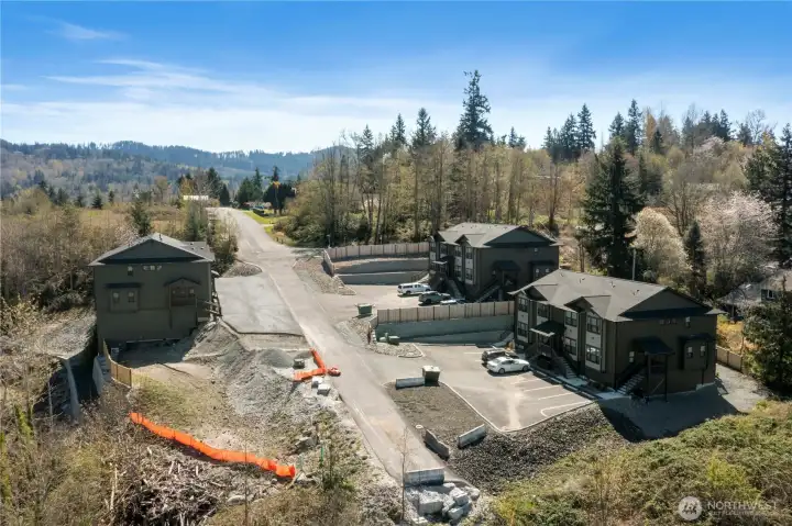 Sweeping panoramic views of Mt. Rainier and sparkling Eatonville city lights greet you from every level of this brand new, never-lived-in 3-story condo in a brand-new 4-plex. This is elevated living at its finest in the gateway to Mt. Rainier National Park. The bright, light-filled main floor is perfect for entertaining, featuring tons of natural light, a huge kitchen with separate pantry, spacious dining room, and generous formal living space — all opening to dramatic mountain and city views. Exceptional upgrades include granite countertops in the kitchen and all bathrooms, custom two-tone cabinetry with a dramatic black island and crisp white upper/lower cabinets, wide white-painted trim finished on-site, and beautiful white panel doors. Luxury vinyl plank flooring covers the main floor, baths, and laundry, while plush carpet warms the rest. See photos of the condo across the street built by the same builder — it showcases many of these same high-quality finishes. The flexible floor plan offers two primary bedrooms upstairs and a third bedroom, full bath, plus bonus room downstairs. Every level captures the stunning views. Construction is 100% complete. Condo recording is near finalized, with FHA, VA, and conventional financing approvals in process. Enjoy a quiet hilltop setting above the city, close to downtown Eatonville and minutes from Mt. Rainier recreation. Don’t miss this rare opportunity for affordable home ownership with luxury finishes and million-dollar views!