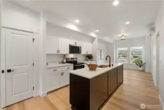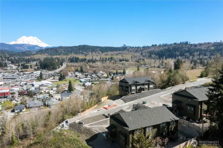 Sweeping panoramic views of Mt. Rainier and sparkling Eatonville city lights greet you from every level of this brand new, never-lived-in 3-story condo in a brand-new 4-plex. This is elevated living at its finest in the gateway to Mt. Rainier National Park. The bright, light-filled main floor is perfect for entertaining, featuring tons of natural light, a huge kitchen with separate pantry, spacious dining room, and generous formal living space — all opening to dramatic mountain and city views. Exceptional upgrades include granite countertops in the kitchen and all bathrooms, custom two-tone cabinetry with a dramatic black island and crisp white upper/lower cabinets, wide white-painted trim finished on-site, and beautiful white panel doors. Luxury vinyl plank flooring covers the main floor, baths, and laundry, while plush carpet warms the rest. See photos of the condo across the street built by the same builder — it showcases many of these same high-quality finishes. The flexible floor plan offers two primary bedrooms upstairs and a third bedroom, full bath, plus bonus room downstairs. Every level captures the stunning views. Construction is 100% complete. Condo recording is near finalized, with FHA, VA, and conventional financing approvals in process. Enjoy a quiet hilltop setting above the city, close to downtown Eatonville and minutes from Mt. Rainier recreation. Don’t miss this rare opportunity for affordable home ownership with luxury finishes and million-dollar views!