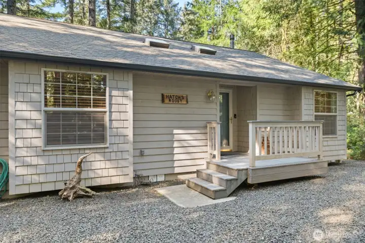 Light and bright with lots of windows and skylights, this well-maintained, 1-level cottage in the woods at Hartstene Pointe gated beach community is a perfect retreat for quiet get-aways and adventures. Two bedrooms, 1 bath, and office. Galley kitchen w/pantry opens to office, and door to private back deck. Dining room w/windows on three sides affords wooded views and slider to deck. Extra features are wood-lined ceilings and built-in window seats in living room and both bedrooms. Large storage shed/shop next to garage. Private location at end of driveway is well graveled. Just a short walk to clubhouse, seasonal pool/spa, fitness center, tennis/sport courts, community gardens and mailroom. Other HP amenities include: miles of private saltwater beaches and walking trails, picnic shelters, new marina, boat ramp, boat storage and more!