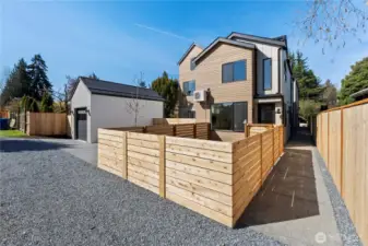 A new collection of standalone residential homes located on a quite street adjacent to Blue Ridge. Walking distance to Carkeek Park, Swansons Nursery. Close to shopping and Restaurants. This standalone townhome is warm and inviting with large windows flood the home with natural light. The Kitchen offers custom Bellmont cabinets Quartz counter top and tile back splash, Laminate hardwood floors through-out the home, stainless steel appliances and custom lighting. Half bath located on the main floor and nice office. Second floor has two bedrooms both with private baths and vaulted ceilings and custom lighting, primary has walk-in closet, laundry located on this floor as well. Mini-splits will keep warm in the winter and cool in the summer. A private fenced and landscaped yard. One designated parking space off the alley with EV hook-up.