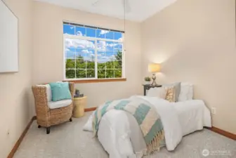 Sunny corner, single-level living with private walk-out access and all the conveniences to love. This rarely available south and east-facing end-unit is filled with natural daylight, relaxing breezes, and seamless walk-out patio access to the beautiful grassy quad & a Cascade mountain backdrop — perfect for morning coffee, pets, and easy indoor/outdoor living. No stairs means effortless and convenient everyday living: pull into your extra-wide garage and step directly inside with groceries, sleeping little ones, or armfuls from Costco. The updated kitchen features new countertops, custom backsplash, a gas cooktop, generous prep space, and large pantry. Brand-new carpet throughout. Spacious primary suite with dual sinks, oversized bath, walk-in closet, and linen storage. Separate laundry room with newer side-by-side washer/dryer. Extra-wide garage + driveway parking. Strong HOA reserves ($2.6M+). Walk to a well-recognized elementary school. Community pool, clubhouse, fitness center & trails. Light-filled. Practical. Designed for real life.