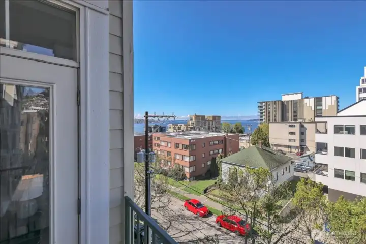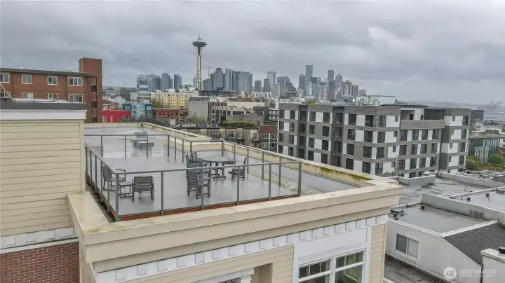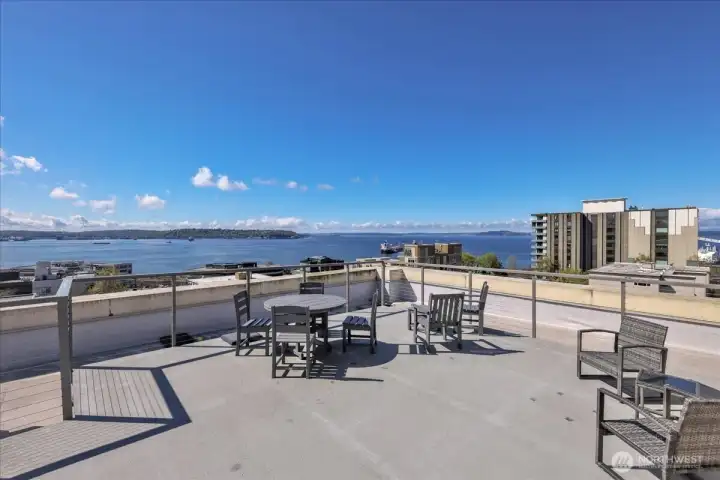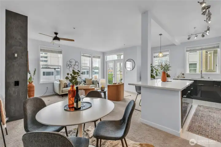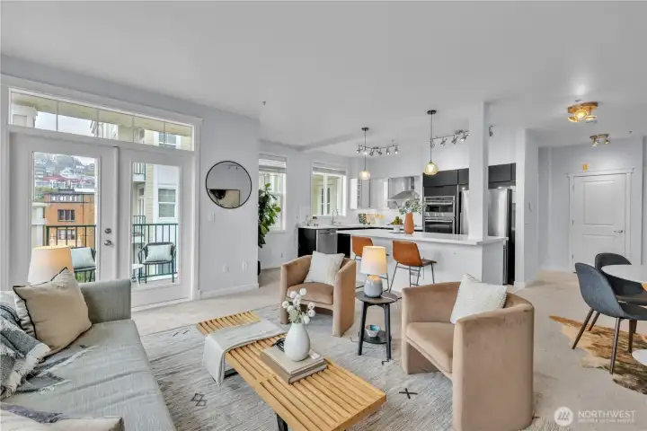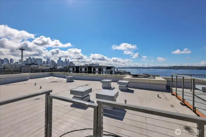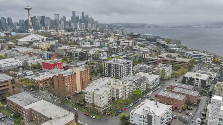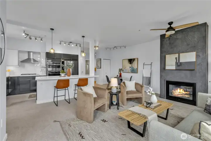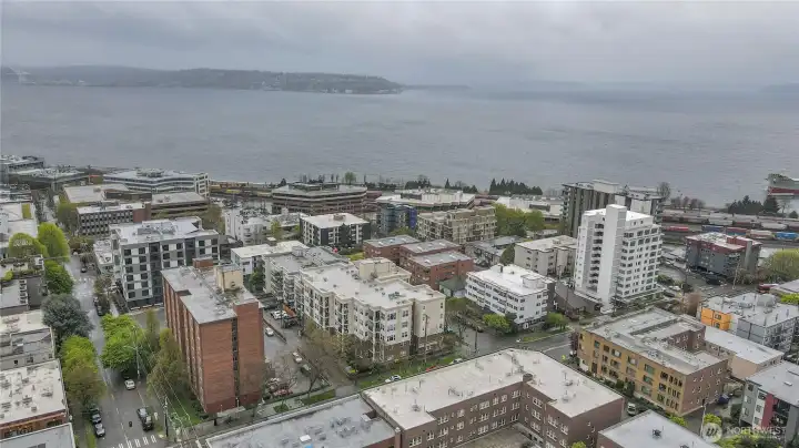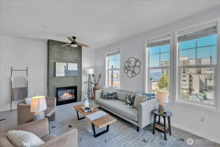 Sweeping west-facing views of Puget Sound and the Olympic Mountains define this modern end-unit condo in the highly desirable IV West, located in the heart of Lower Queen Anne. Soaring ceilings and expansive windows fill the home with natural light, while a private balcony provides the perfect place to take in stunning sunsets and water views. The open-concept layout is designed for comfortable living and easy entertaining, anchored by a striking redesigned fireplace in the main living area.The chef’s kitchen features a stylish island, newer stainless steel appliances, gas range, eating bar, and dedicated dining space that flows seamlessly into the living room. The spacious primary bedroom includes a custom California walk-in closet, complemented by a beautifully remodeled bath with tiled rain shower and an oversized laundry room for added convenience.Secure gated entry and an impressive shared rooftop deck offer panoramic views of the Sound, city skyline, and Space Needle. Strong, well-managed HOA with low dues covering water, sewer, garbage, gas, and earthquake insurance. One secure garage parking space and storage included. Ideally located near Climate Pledge Arena, theaters, dining, festivals, and everything Lower Queen Anne has to offer.Brand new carpets!
