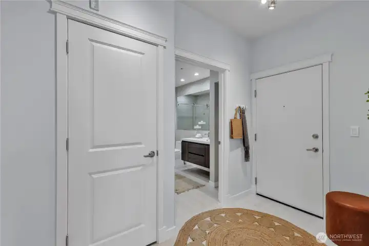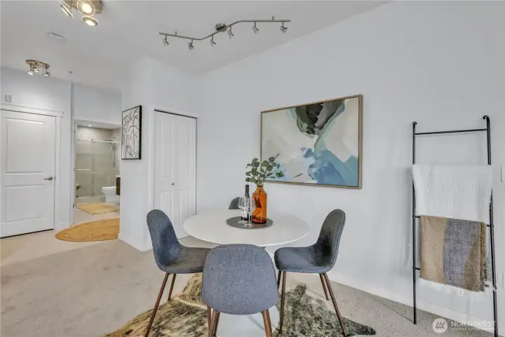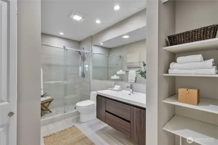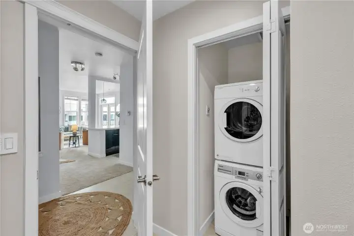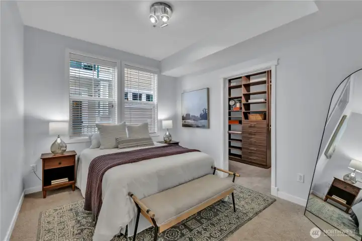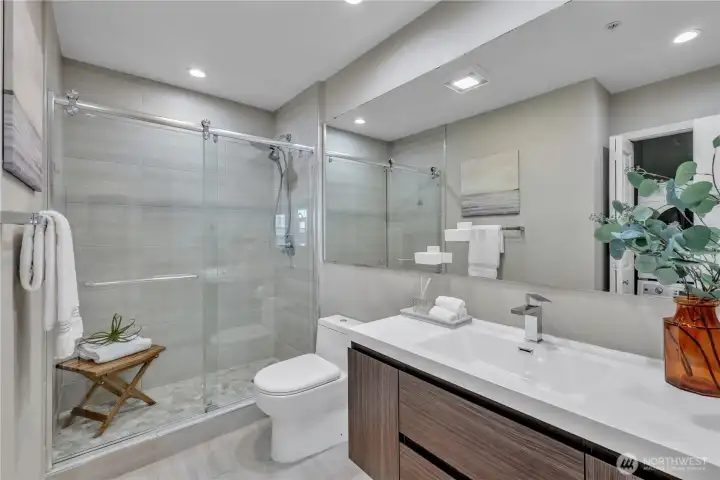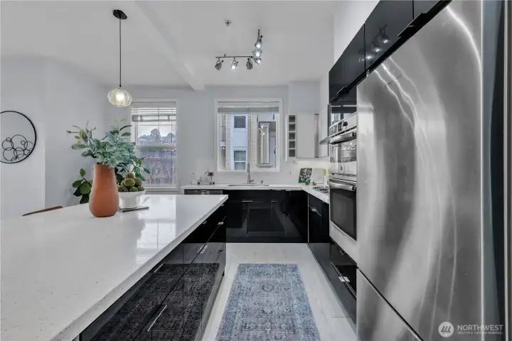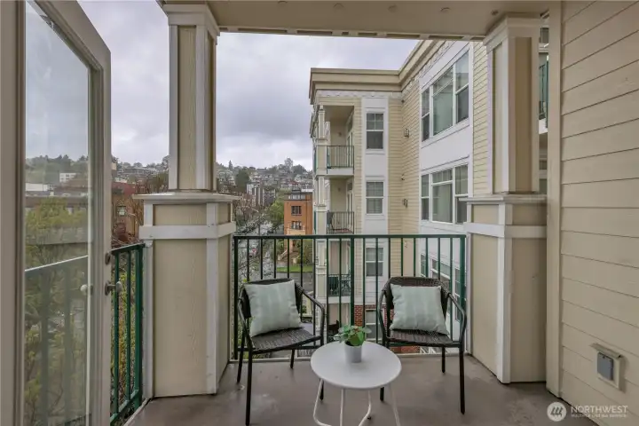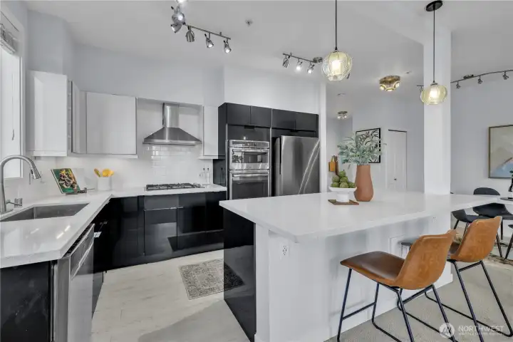 Sweeping west-facing views of Puget Sound and the Olympic Mountains define this modern end-unit condo in the highly desirable IV West, located in the heart of Lower Queen Anne. Soaring ceilings and expansive windows fill the home with natural light, while a private balcony provides the perfect place to take in stunning sunsets and water views. The open-concept layout is designed for comfortable living and easy entertaining, anchored by a striking redesigned fireplace in the main living area.The chef’s kitchen features a stylish island, newer stainless steel appliances, gas range, eating bar, and dedicated dining space that flows seamlessly into the living room. The spacious primary bedroom includes a custom California walk-in closet, complemented by a beautifully remodeled bath with tiled rain shower and an oversized laundry room for added convenience.Secure gated entry and an impressive shared rooftop deck offer panoramic views of the Sound, city skyline, and Space Needle. Strong, well-managed HOA with low dues covering water, sewer, garbage, gas, and earthquake insurance. One secure garage parking space and storage included. Ideally located near Climate Pledge Arena, theaters, dining, festivals, and everything Lower Queen Anne has to offer.Brand new carpets!