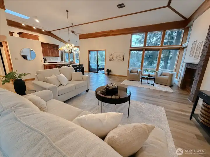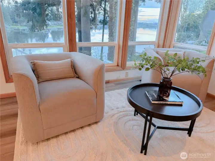 Vaulted ceilings & walls of windows flood the home with natural light & stunning lake views