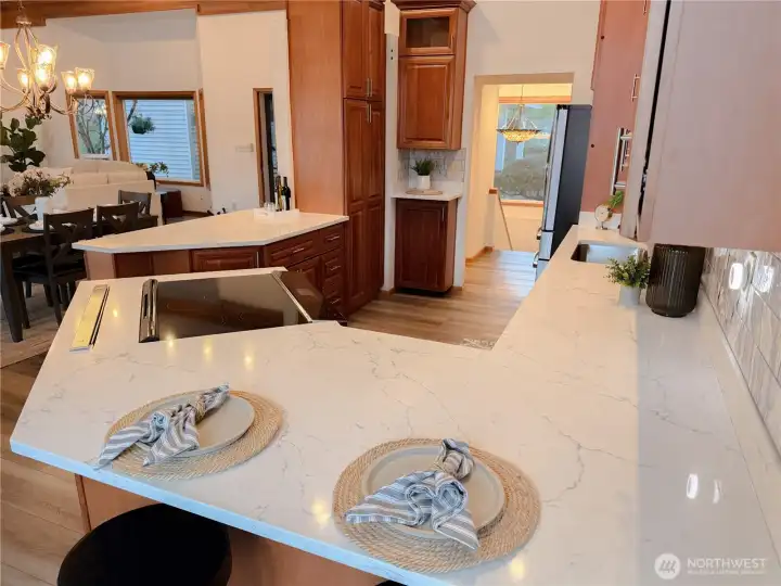 Gourmet kitchen featuring American cherry cabinetry, quartz countertops, & newer stainless appliances, including a French door refrigerator & induction cooktop