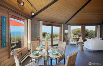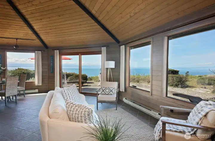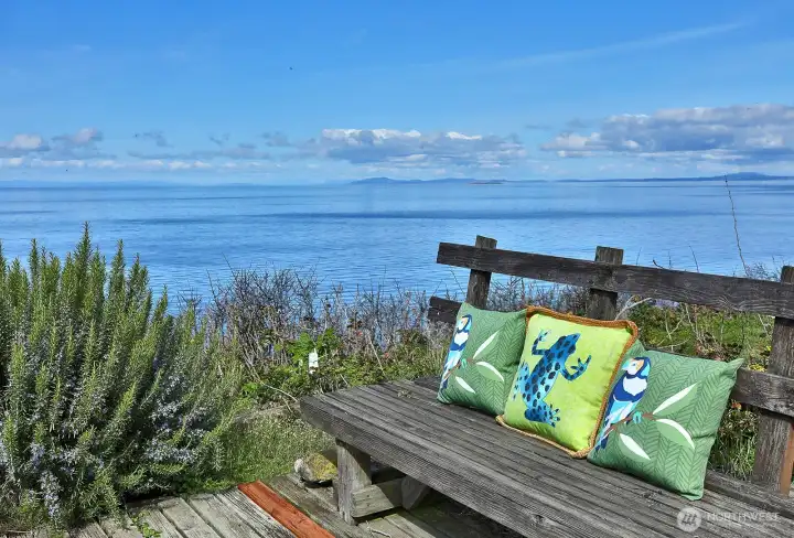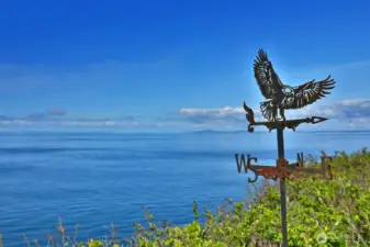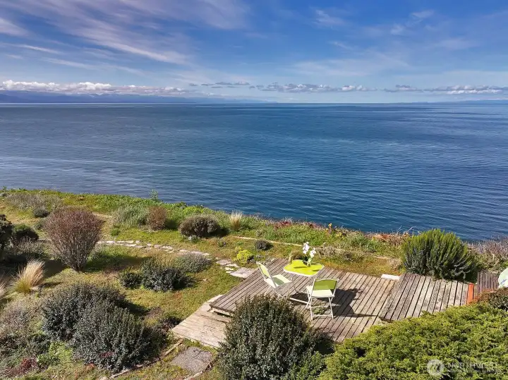 Envision this as your Whidbey Island sanctuary, weekend retreat, or VRBO! This remarkable two-parcel property boasts approximately 111 +/- feet of coveted westside waterfront, offering breathtaking panoramic views of the Strait of Juan de Fuca, the Olympic mountain range, and bustling shipping lanes. Enjoy a front-row seat to magnificent sunsets, the soothing sound of waves along the shore, and vibrant marine activity. Follow a private path to a scenic view deck, where you'll find yourself eye level with soaring eagles and endless vistas. The home, a classic Yonkman remodel from 1986, features timeless elements like tongue-and-groove ceilings, expansive picture windows, a Sub-Zero refrigerator, and quartz countertops. Upstairs, you'll find two primary bedrooms, while a third bedroom is conveniently located on the main floor. The versatile loft can be transformed into an office, gym, or creative studio. The spacious two-car garage includes an EV charger just outside the garage. Set on half an acre, with an additional lot featuring a 3-bedroom site registration, this property is part of the desirable Sierra Club beach community, providing beach access, a summertime pool, and a clubhouse.