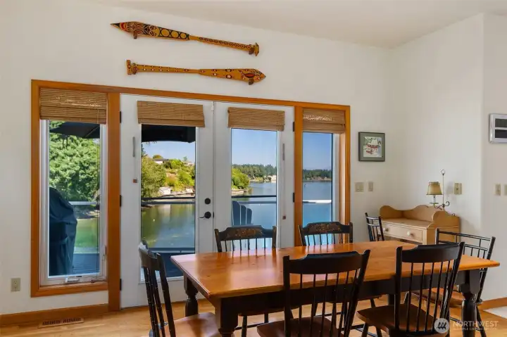 Views from the kitchen to the water and easy access to the dining area. An entertainer's dream! Warm hardwood flooring and loads of light here