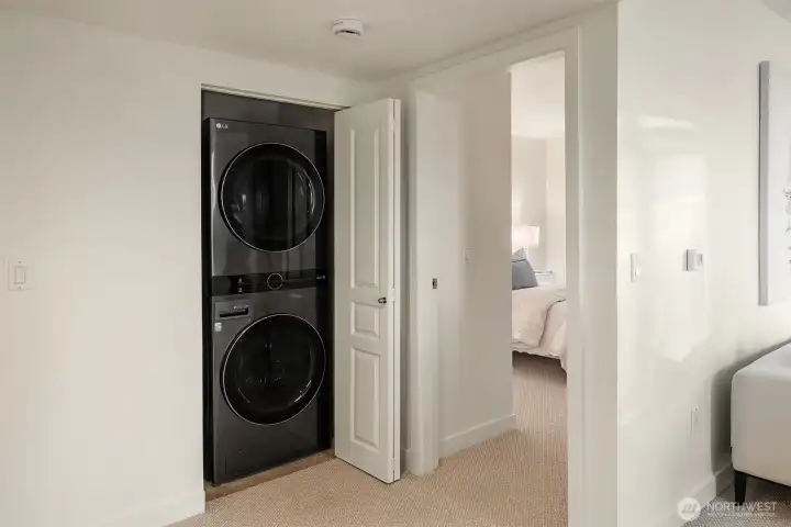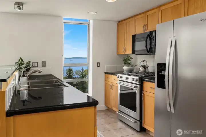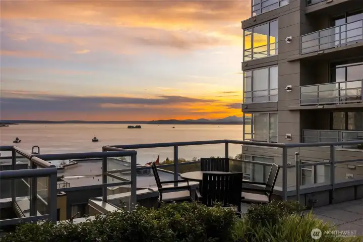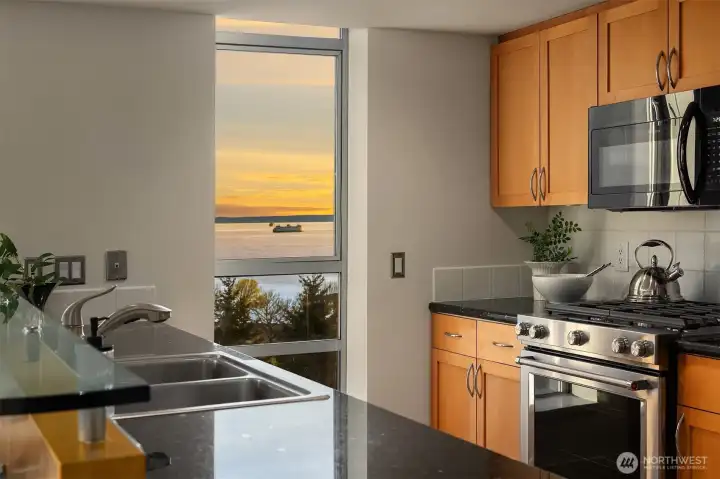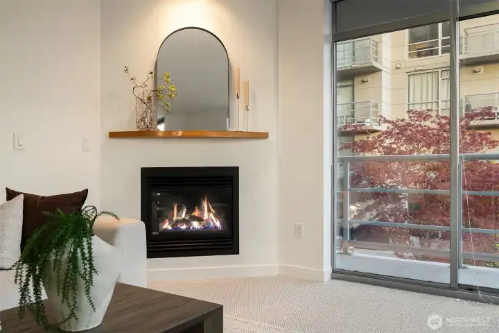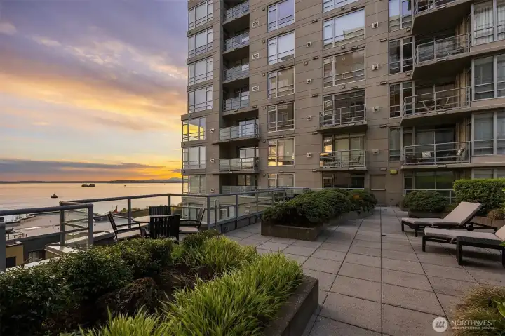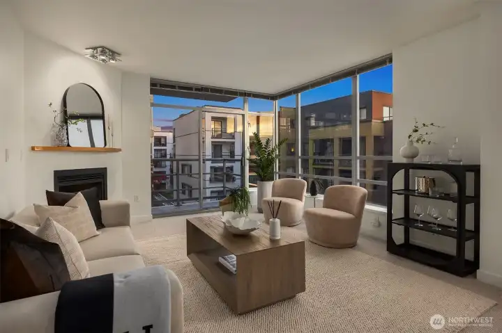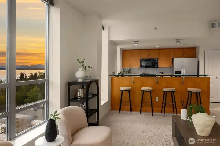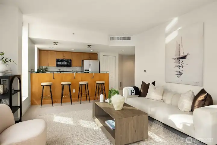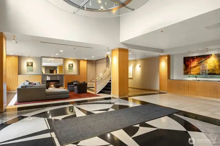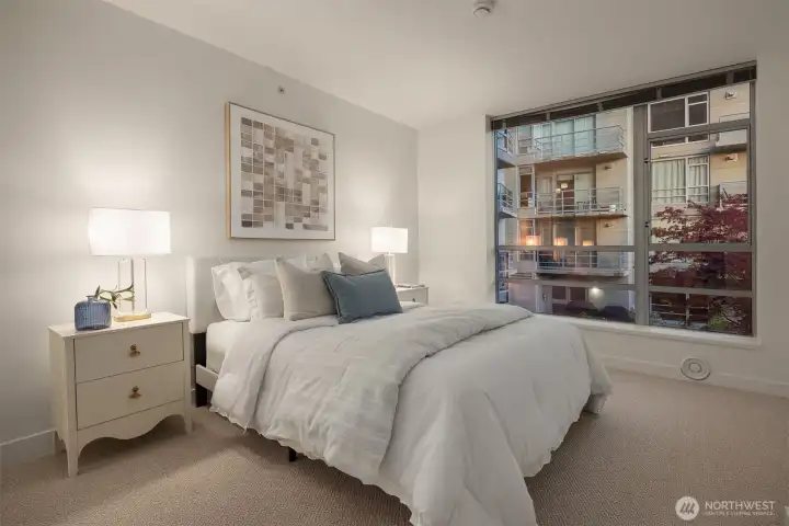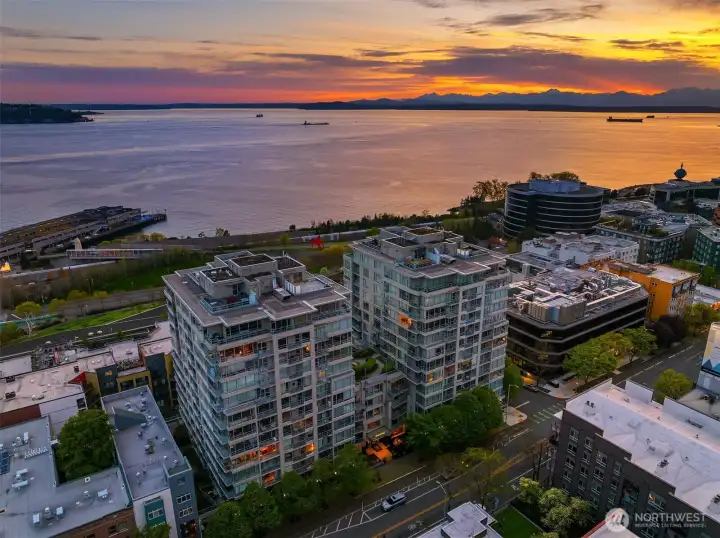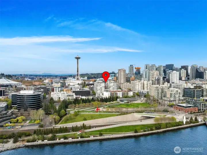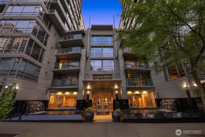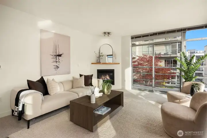 Urban elegance meets effortless city living at The Concord. This beautifully maintained residence is set within one of Belltown’s most sought-after concrete-and-steel buildings, known for its timeless architecture, 24/7 concierge and serene views of Puget Sound and the Olympic Sculpture Park. Residents enjoy upscale amenities including a state-of-the-art fitness center, jacuzzi/sauna, business center, two tranquil courtyards with water features and Sound views, an entertainment lounge with full kitchen, and a furnished guest suite. Secure garage parking with a dedicated storage locker completes the offering. This southwest-facing corner home is filled with natural light and thoughtfully designed for comfort & style. Highlights include a spacious entry, heigh ceilings, floor-to-ceiling windows with captivating Sound & Sculpture Park views. The open-concept kitchen flows seamlessly into the living area—ideal for everyday living and entertaining. Recent upgrades include a five-burner gas cooktop with electric range, stainless steel refrigerator with ice maker, full-size washer/dryer, A/C, and new Berber carpet paired with stone tile flooring. A cozy gas fireplace and private balcony add warmth, while the generously sized bedroom offers a peaceful retreat. Moments from Climate Pledge Arena, Seattle Center, the revitalized waterfront, Pike Place Market, world-class dining, and Amazon’s campus, The Concord offers the perfect blend of luxury, convenience, and vibrant city living.