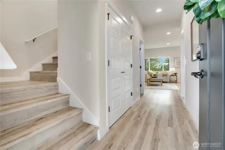 The front of the home has the access to the bedroom suites, and a 1/2 bath for guests.