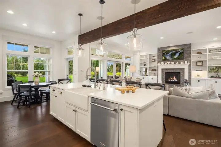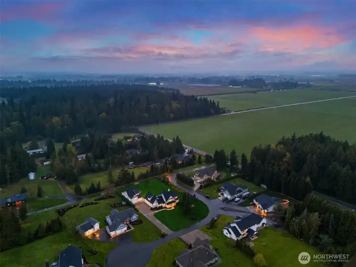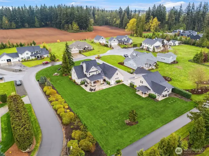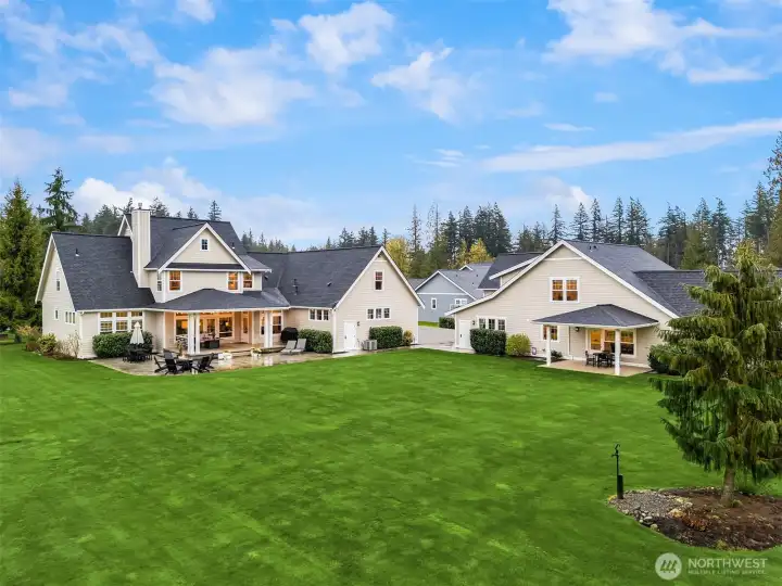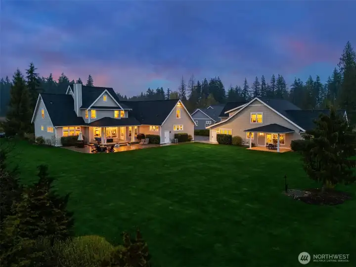 Rare Lynden estate with guest house on nearly 1 acre in a quiet cul-de-sac, offering luxury living, multigenerational flexibility, and investment potential near downtown Lynden and an easy drive to Bellingham. Built in 2018, this custom property includes a 3,500+ SF main home with 4 bedrooms, 4 baths, vaulted ceilings, open-concept living, abundant natural light, hardwood floors, designer tile, statement fireplace, chef’s kitchen with premium appliances, walk-in pantry, breakfast nook, bonus room for office, media, or gym, and attached garage. The separate ADU / guest house is fully independent with its own kitchen, living space, baths, and laundry, ideal for multigenerational living, guests, extended stay housing, or private work-from-home setup. Set on 0.81 acres of manicured, park-like grounds with lush lawn, curated outdoor living, room for gardening or play, separate driveways, abundant parking, and RV garage. Infrastructure includes shared well and dual septic systems. Enjoy privacy, space, and versatility with close access to Lynden schools, shops, restaurants, and everyday amenities. A rare Northwest Washington opportunity for buyers searching dual living, two homes on one property, guest quarters, luxury acreage, or flexible living near Lynden and Bellingham.
