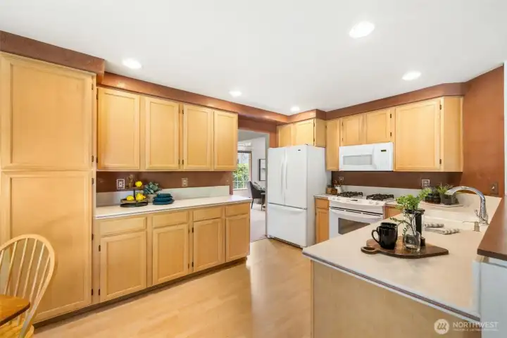 A chef-friendly kitchen featuring ample counter space, warm cabinetry and updated flooring.