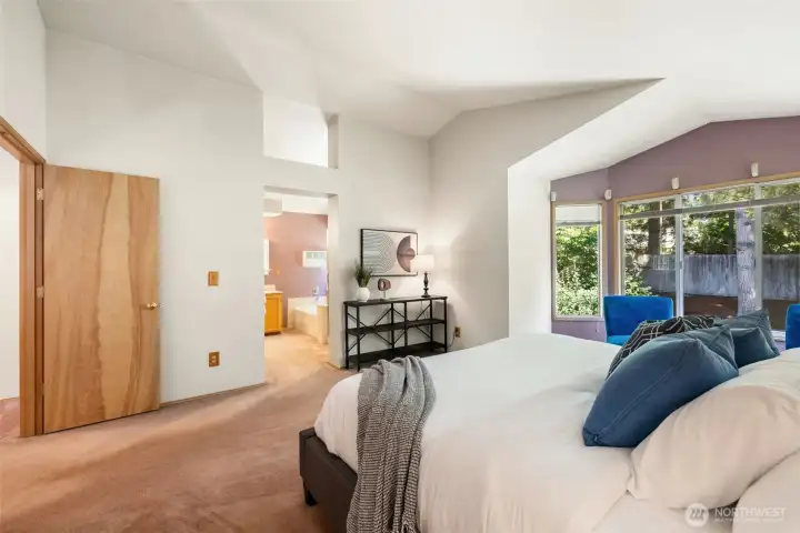Primary Suite offers spacious retreat with vaulted ceiling.