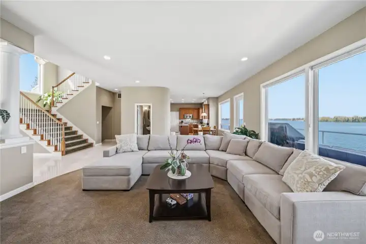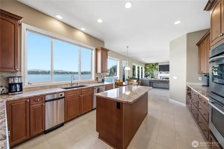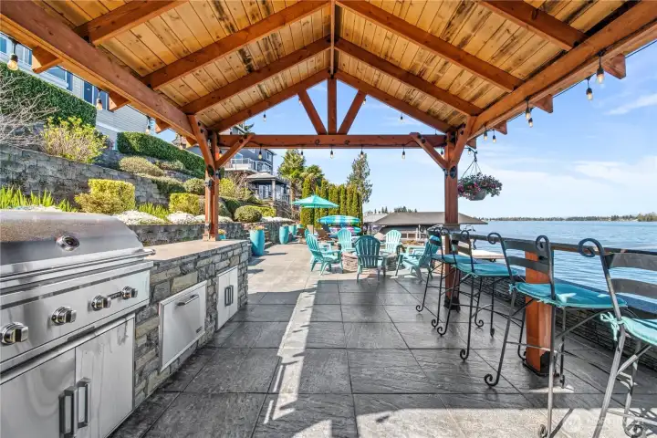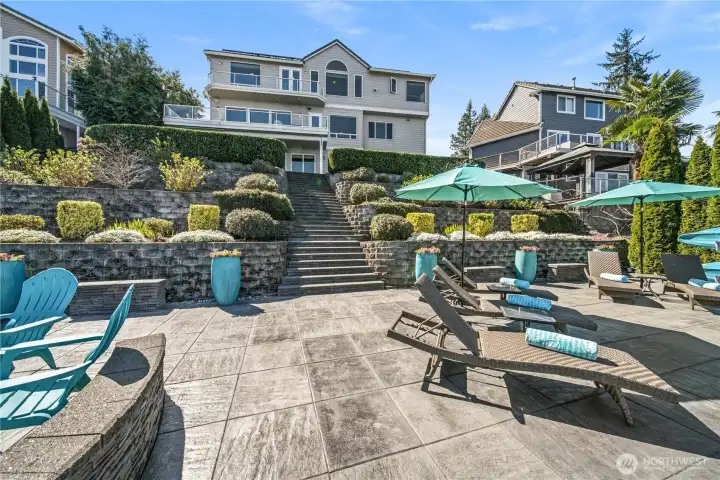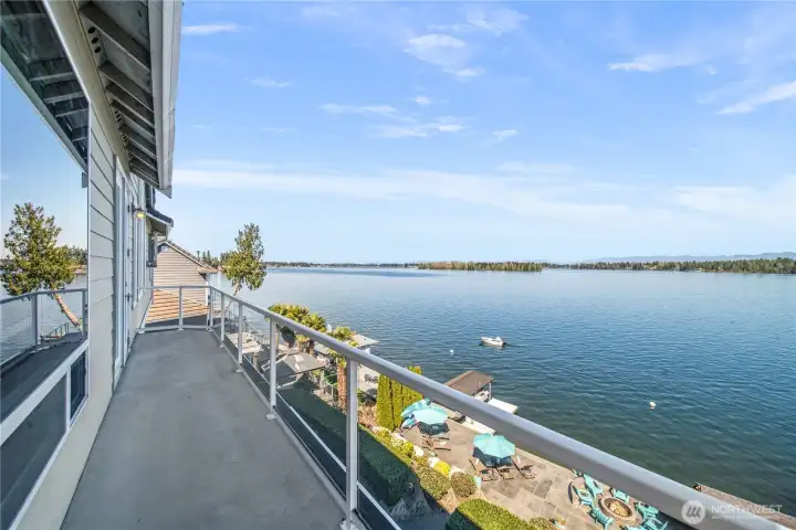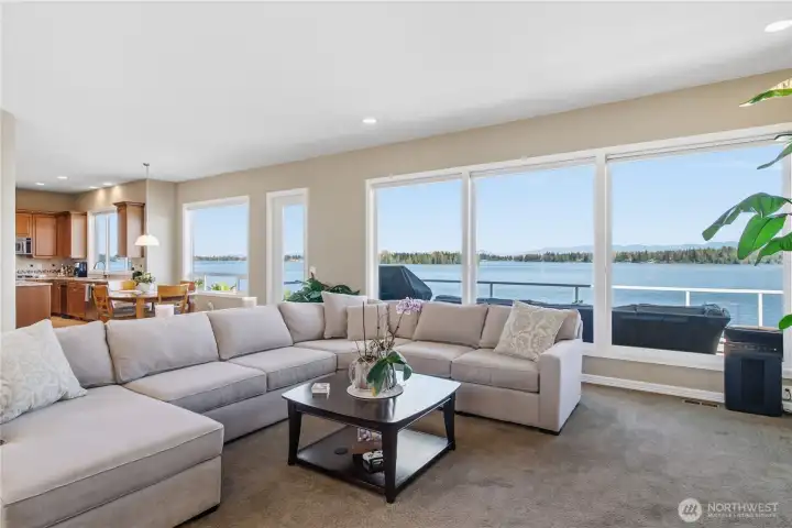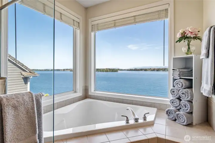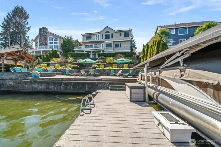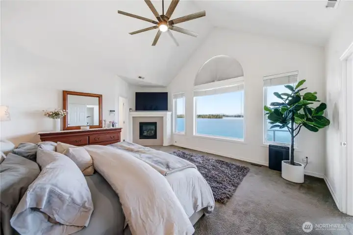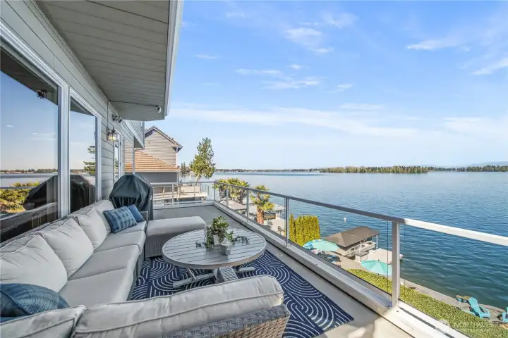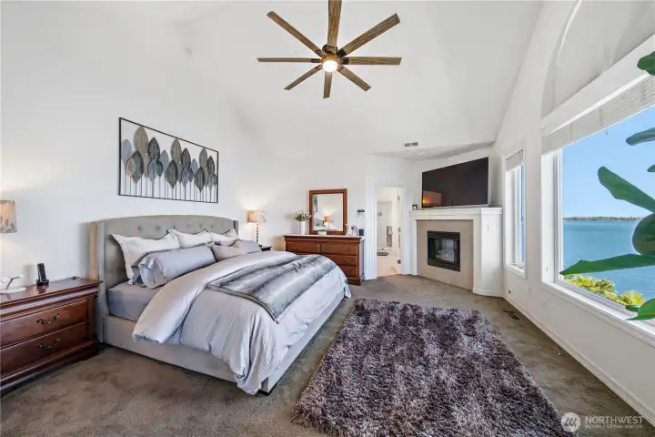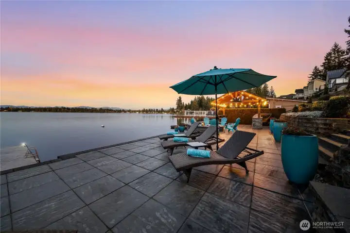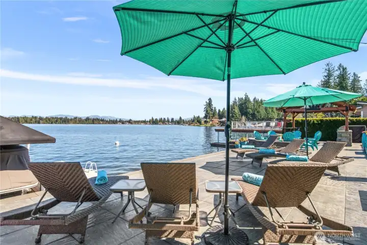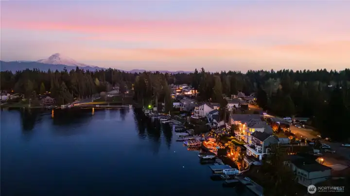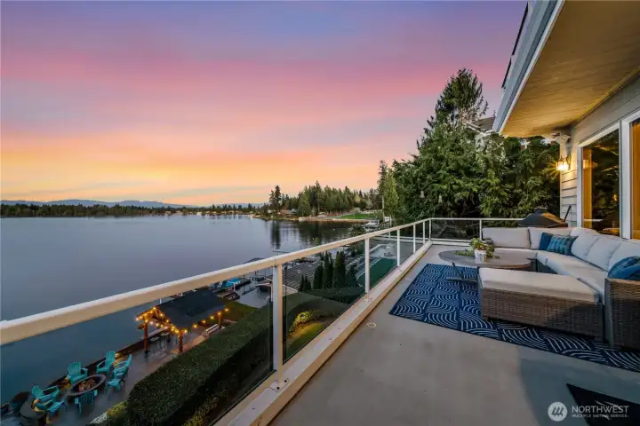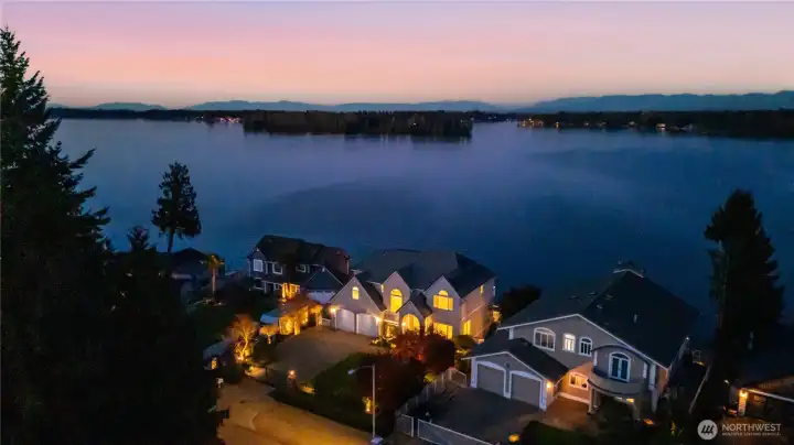 Commanding a premier open-water setting on Lake Tapps, this exceptional 4,360 sq ft custom residence captures sweeping panoramic views of the lake & the breathtaking Cascade Mountain range. Designed to embrace both luxury & lifestyle, the home showcases a timeless stucco exterior, tile roof, & a thoughtfully designed layout offering 3 bedrooms plus a private office, loft, rec room, & dedicated exercise room—providing flexibility for multi-generational living, entertaining, or working from home. Walls of windows frame the spectacular scenery, while the oversized great room & formal dining area create an impressive yet inviting atmosphere. The chef’s kitchen is beautifully appointed with marble flooring, upgraded cabinetry, a large island, & seamless flow to an expansive entertainment deck—perfect for hosting while enjoying the sweeping water & mountain views. The lakeside experience continues outdoors with a stunning patio featuring an island BBQ, gazebo, & professionally designed landscaping with irrigation and landscape lighting. A gated entry enhances privacy and curb appeal. Thoughtful upgrades include a 10.2 kW solar system producing approximately 50% of annual power usage, dual Tesla Powerwall battery backup for uninterrupted service, Trane heat pump with dual-fuel gas furnace, full security system with cameras, & automatic gate. Located near sought-after Jenks Point park amenities, this rare waterfront offering delivers refined lakefront living at it's finest.