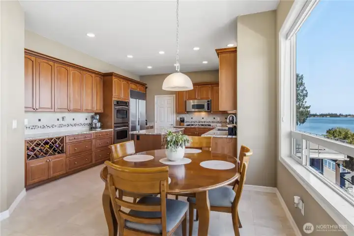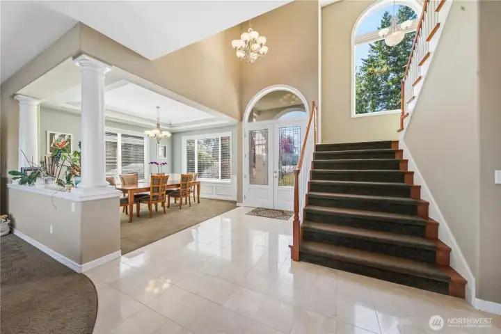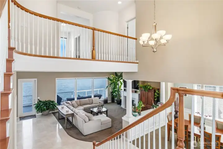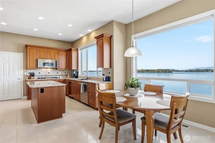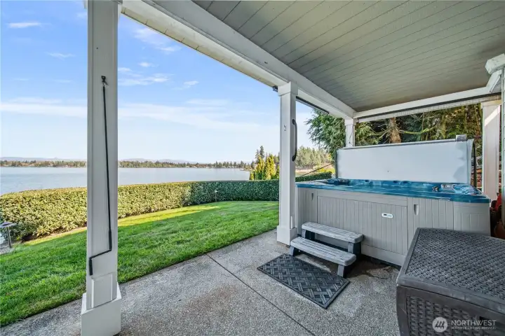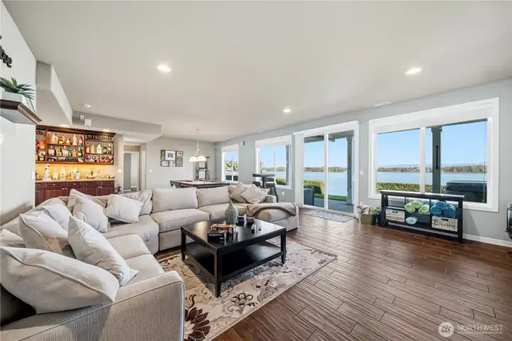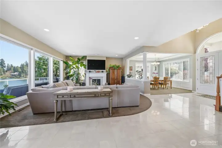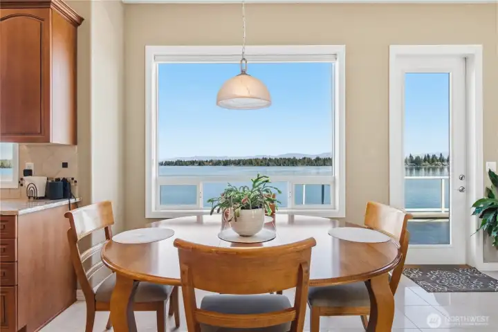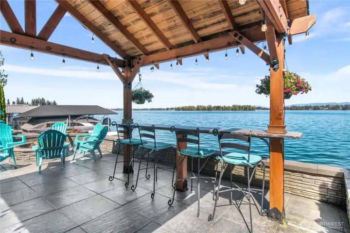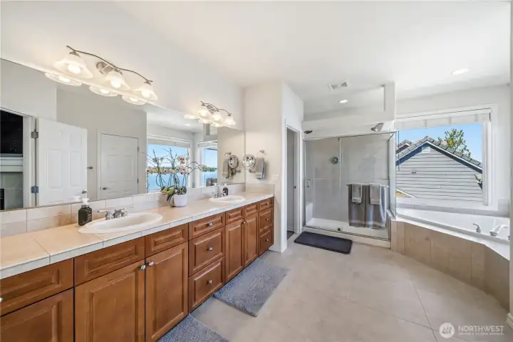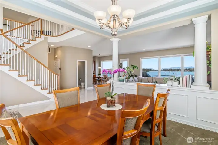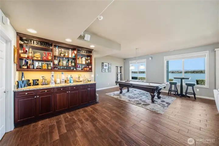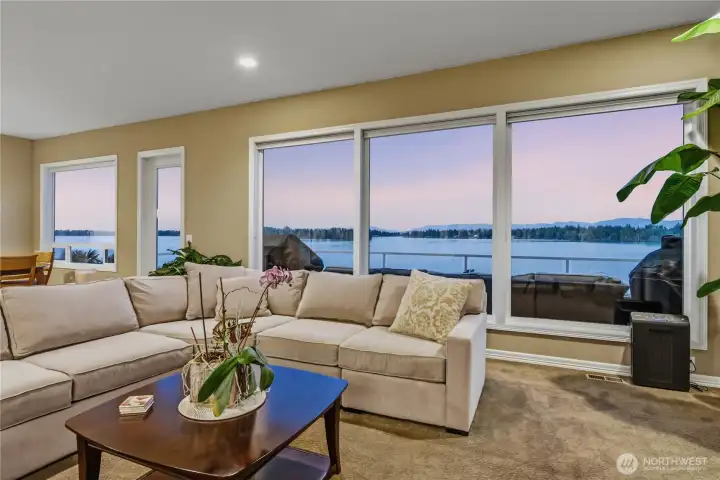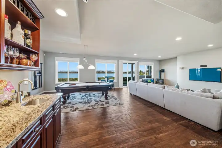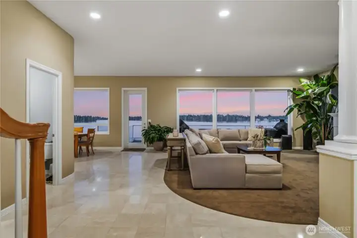 Commanding a premier open-water setting on Lake Tapps, this exceptional 4,360 sq ft custom residence captures sweeping panoramic views of the lake & the breathtaking Cascade Mountain range. Designed to embrace both luxury & lifestyle, the home showcases a timeless stucco exterior, tile roof, & a thoughtfully designed layout offering 3 bedrooms plus a private office, loft, rec room, & dedicated exercise room—providing flexibility for multi-generational living, entertaining, or working from home. Walls of windows frame the spectacular scenery, while the oversized great room & formal dining area create an impressive yet inviting atmosphere. The chef’s kitchen is beautifully appointed with marble flooring, upgraded cabinetry, a large island, & seamless flow to an expansive entertainment deck—perfect for hosting while enjoying the sweeping water & mountain views. The lakeside experience continues outdoors with a stunning patio featuring an island BBQ, gazebo, & professionally designed landscaping with irrigation and landscape lighting. A gated entry enhances privacy and curb appeal. Thoughtful upgrades include a 10.2 kW solar system producing approximately 50% of annual power usage, dual Tesla Powerwall battery backup for uninterrupted service, Trane heat pump with dual-fuel gas furnace, full security system with cameras, & automatic gate. Located near sought-after Jenks Point park amenities, this rare waterfront offering delivers refined lakefront living at it's finest.