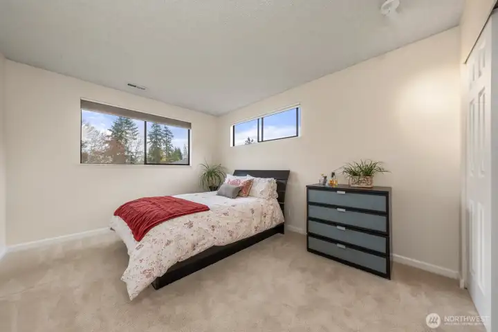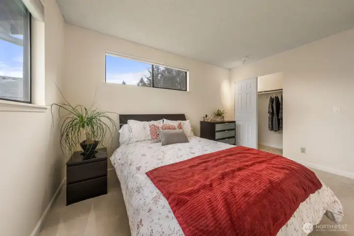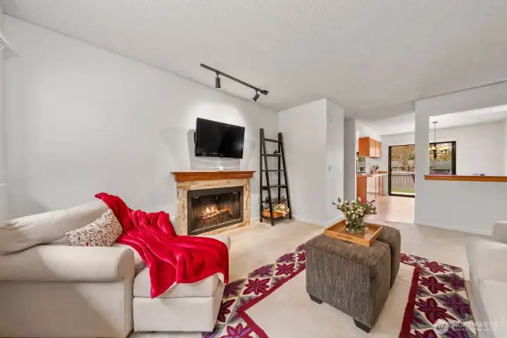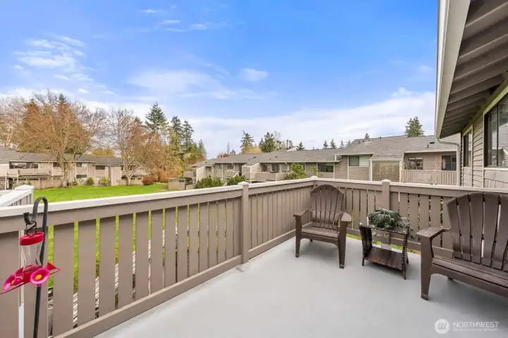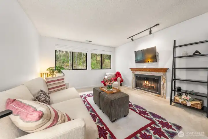 Welcome to your peaceful retreat! A 3 Bedroom, 2 Bath, top-floor, end unit condo with tons of natural light, a private deck, and an expansive, shared backyard to enjoy the beautiful PNW all year round. A spa-style bathroom in the primary with heated floors, a walk-in closet, and plush carpeting. This condo features an in-unit washer and dryer, 2 designated parking spaces, upgraded windows, new paint, cherry wood kitchen cabinetry, hickory hardwood floors, a wood burning fireplace, and a new induction cooktop. Outside feels like a nature preserve. This condo is a rare find! Close to Juanita Beach Park, Kirkland & Bothell with new sidewalks and bike lanes outside of the complex.