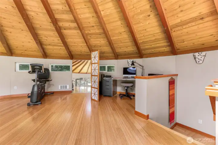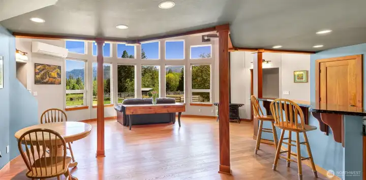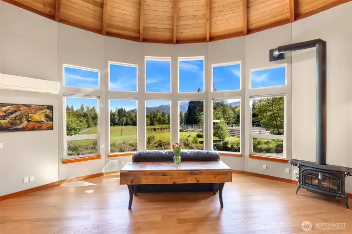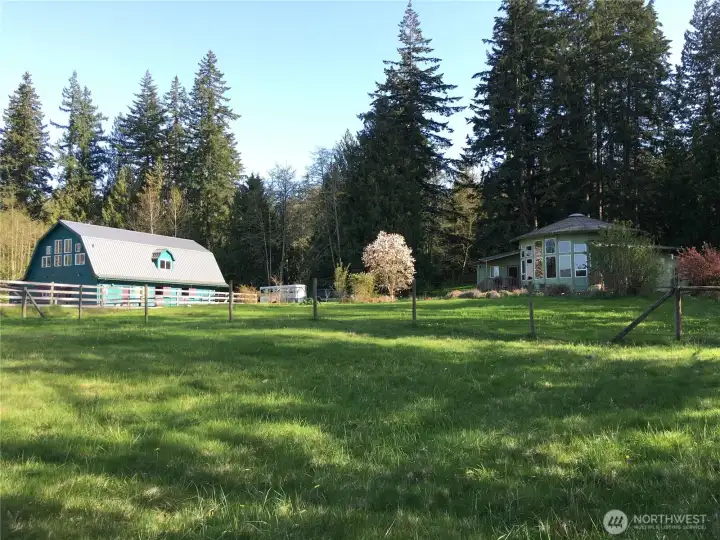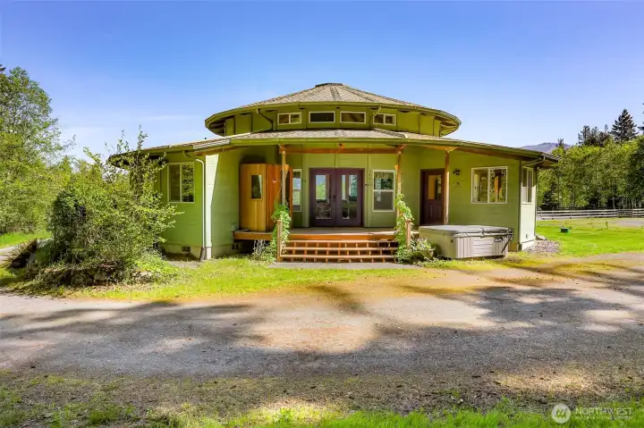 Tucked away on a quiet dead-end road just 8 miles from Bellingham and only an hour to Mt. Baker, this beautiful 10.6-acre property is impeccably designed with horse lovers and nature enthusiasts in mind. The land borders extensive trail riding opportunities on Stewart Mountain and features over 4 acres of fenced pasture, a full-size outdoor arena, and an oversized paddock and horse shed. The custom 36' x 60' 4-stall barn is a standout, complete with a mother-in-law apartment featuring a full bathroom, plus a massive unfinished second level with power and water—ideal for storage, studio space, or future expansion. The custom-built round yurt-style home spans 1,938 sq ft and showcases a dramatic bank of picture windows framing captivating views of Sumas Mountain. Inside, you’ll find 2 bedrooms, 1.75 baths, soaring vaulted ceilings, hardwood floors, energy efficient radiant in-floor heat, mini-split A/C, granite countertops and stainless steel appliances. Step outside to relax in the luxurious hot tub and sauna, or take a peaceful walk in 3 acres of included private forest.