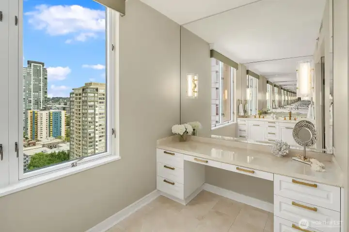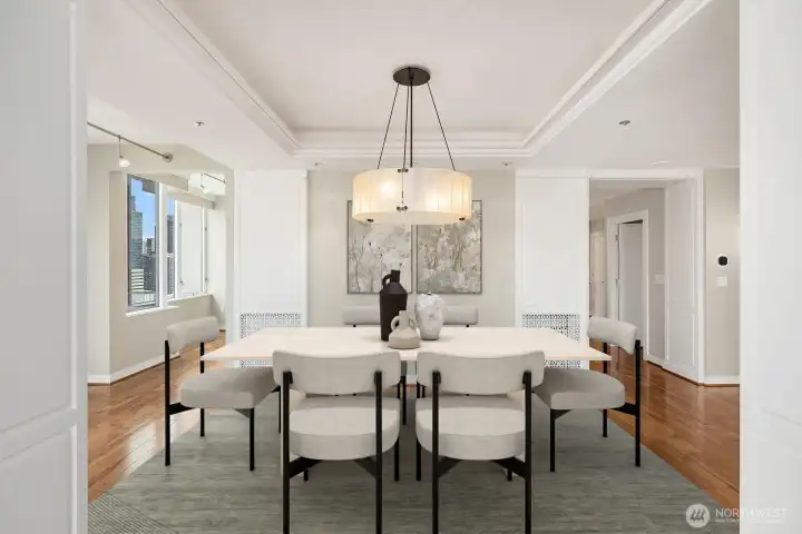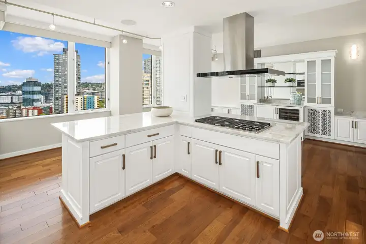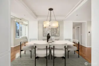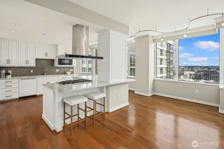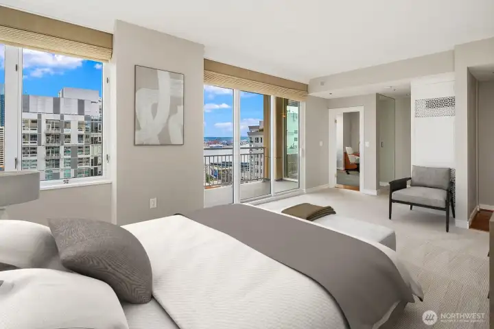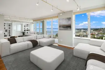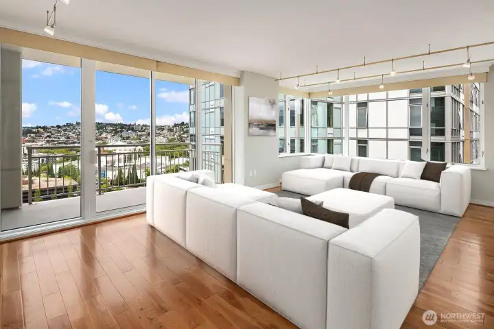 Elevated above the vibrant heart of Belltown, this exceptional penthouse at Seattle Heights offers a rare opportunity to own one-half of the 25th floor in one of the city’s most enduring high-rise residences. Contemporary design meets breathtaking, iconic views, creating a home that is both sophisticated and inviting. Expansive formal living and dining spaces are framed by rich hardwood floors and walls of windows that capture sweeping 180-degree vistas, including the majestic silhouette of Mt. Rainier.At the center of the home, a beautifully appointed kitchen anchors daily living and entertaining alike, featuring crisp white cabinetry, sleek slab countertops, and warm brass fixtures—an inspiring space for both casual meals and elevated gatherings. The serene primary suite is a true retreat, complete with a private patio, panoramic outlooks, a spa-inspired five-piece bath, and a generous walk-in closet. Additional conveniences elevate everyday living, including three side-by-side parking spaces, a large walk-in climate-controlled storage unit, and a spacious laundry room with an additional refrigerator—rare and valuable amenities in downtown living.Seattle Heights offers an unmatched lifestyle with a full suite of amenities, including 24-hour doorman service, concierge, fitness center, indoor pool and spa, rooftop terrace, and resident recreation spaces. Experience refined, resort-style living just moments from Pike Place Market and world-class dining.