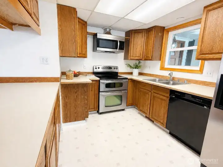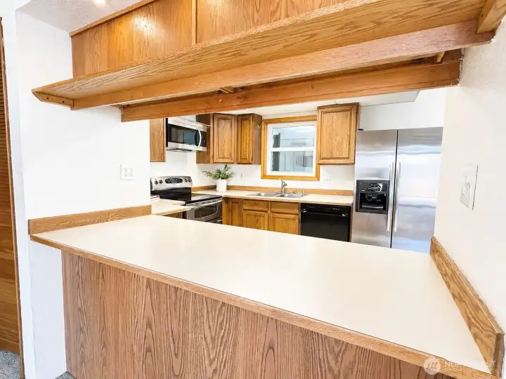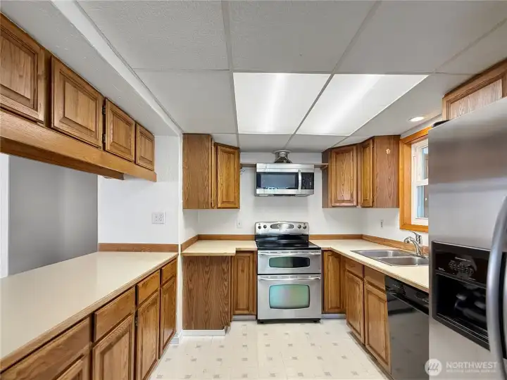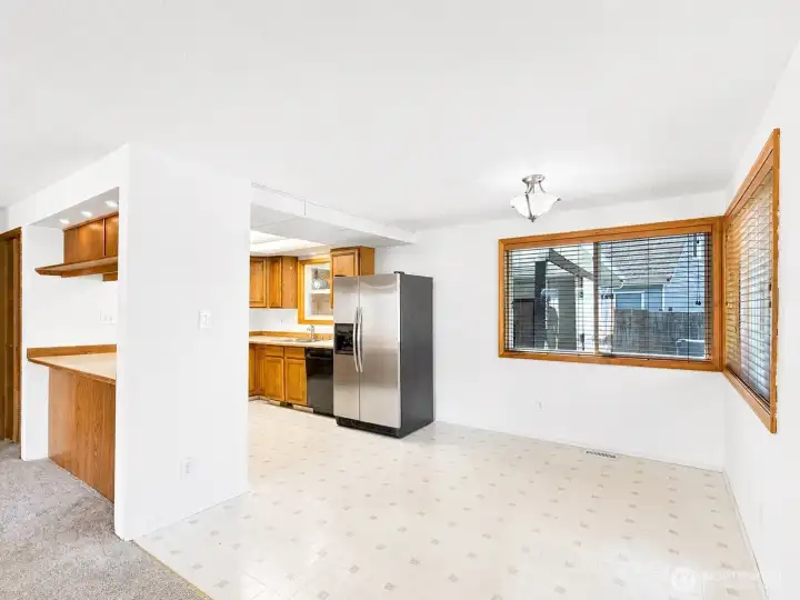 Kitchen has eat in counter, dining space overlooks the living room. Living room has sliders leading to deck and fenced yard. There is also access to the backyard off the familyroom.