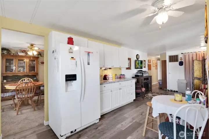 Soooo much cabinet space. Beautiful high quality flooring- refrigerator stays!