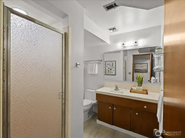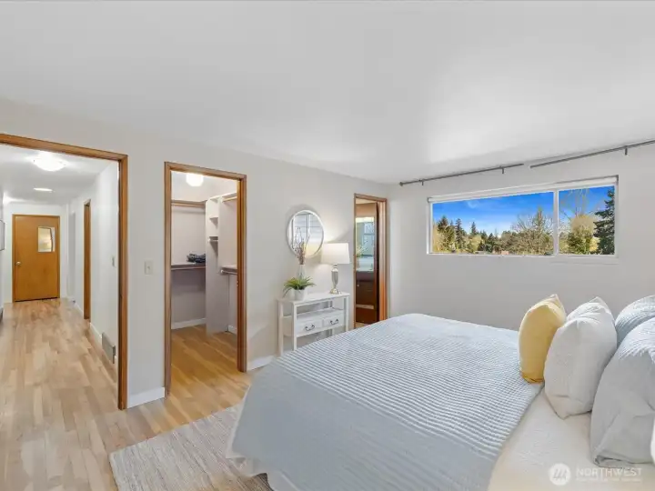 The primary bedroom has hardwood floors. The suite includes a 3/4 bath and walk-in closet.