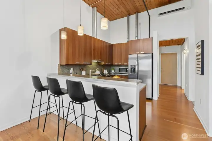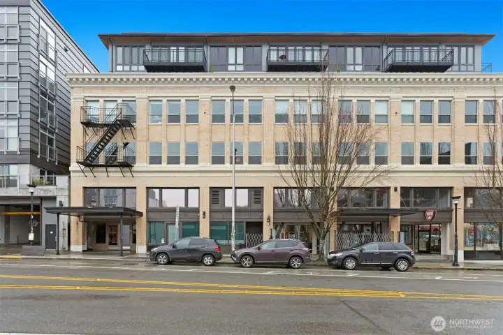 Experience urban loft living at the iconic historic Trace Lofts. This stylish residence features reclaimed Douglas Fir floors with southern exposure. The clerestory windows fill this condo with natural light, making it feel larger due to the tall ceiling. When visiting this home, you’ll finally say, “Wow! This is a cool, well-designed home.” The open-concept living space includes a very comfortable modern kitchen with stainless steel appliances, under-cabinet lighting, and contemporary finishes—perfect for everyday living and entertaining. Step outside through the French doors to your private balcony or enjoy the building’s rooftop deck, which offers chaise lounge chairs, or nestle around the gas fire pit with friends in a very comfortable space. This 1-bedroom, 1-bathroom condo boasts 807 sq ft of thoughtfully designed space, blending historic character with modern comfort. As you enter the lobby, you'll see sewing machines that reflect the factory that occupied this building years ago. The building offers a secure package delivery area. One secured parking space is included, with an additional parking space available. The building is clean, with a well-maintained community reflecting a well-run HOA. Located in one of Seattle’s most walkable neighborhoods, with a Walk Score of 99, you’re just steps from restaurants, coffee shops, nightlife, groceries, and entertainment. A rare opportunity to own a piece of Seattle’s historic warehouse loft living.