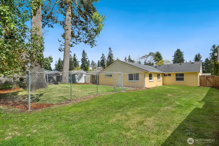 Enclosed fenced yard, yard expands past the fence line on the left side of image through the trees.