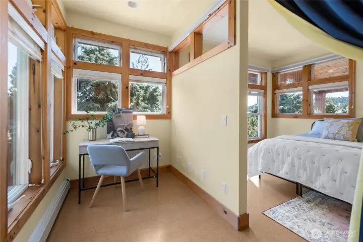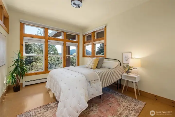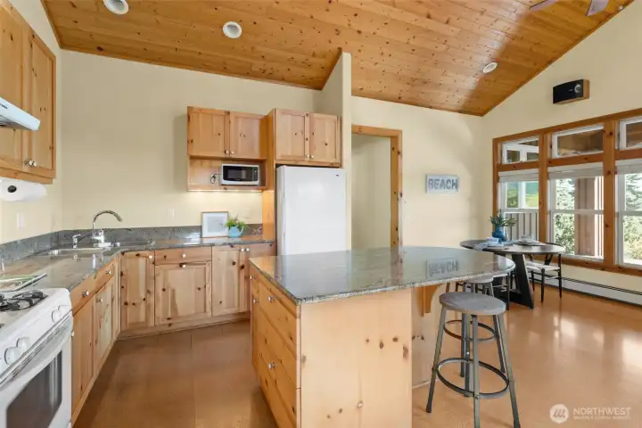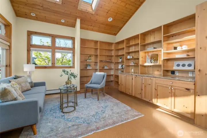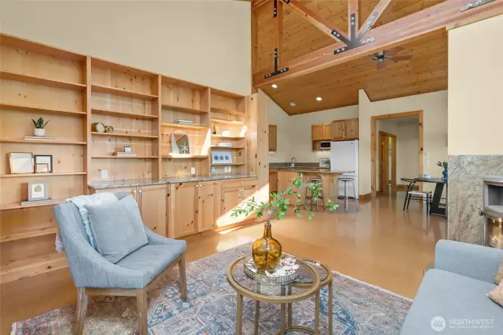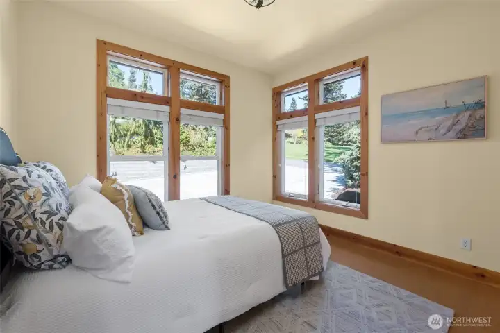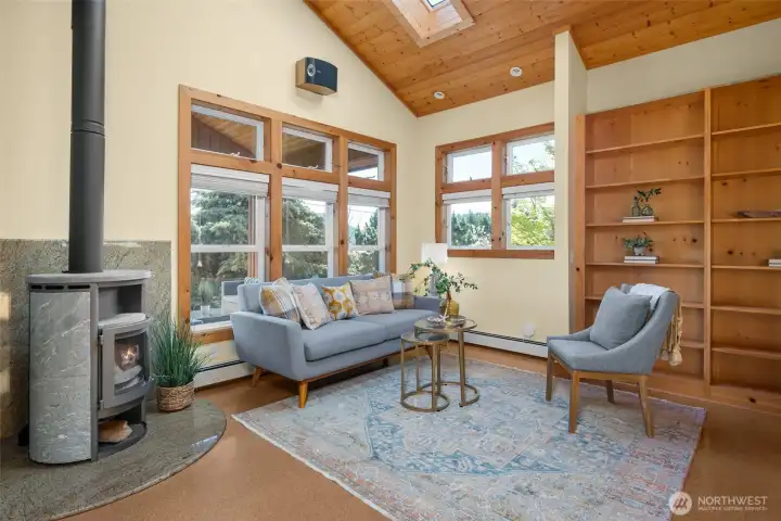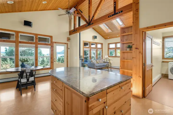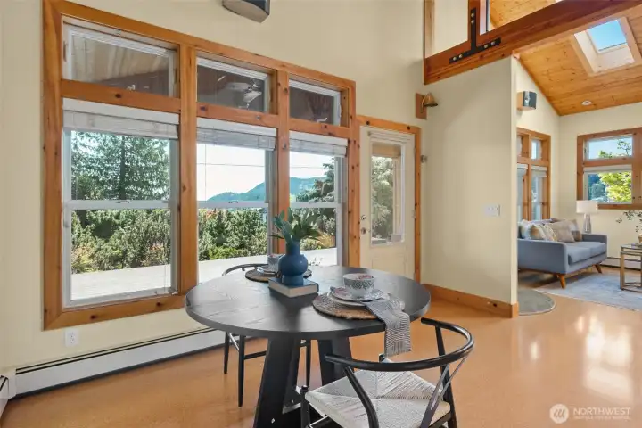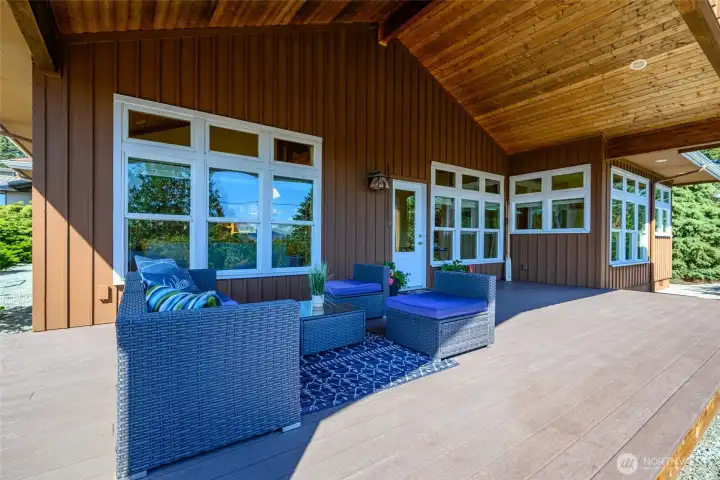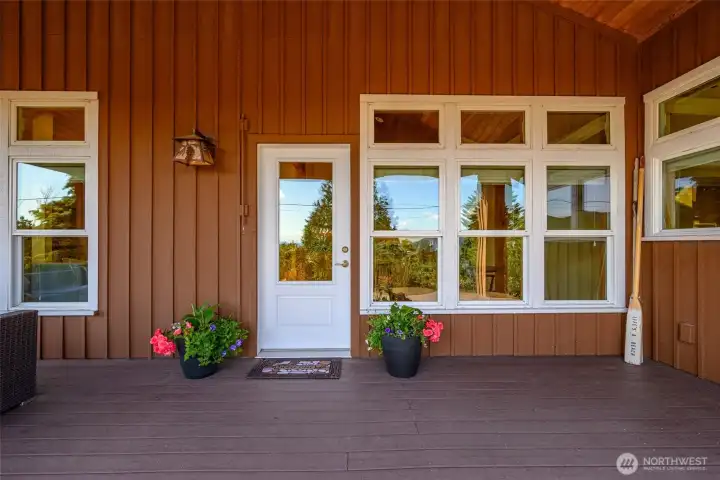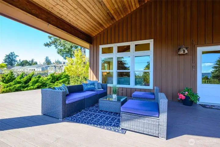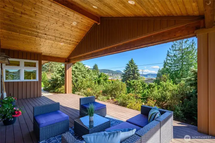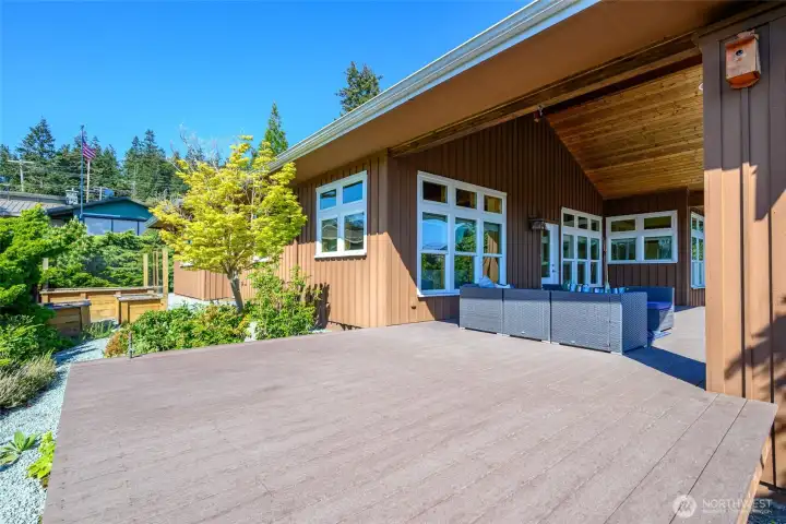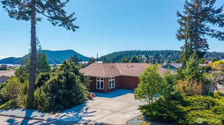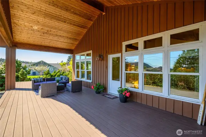 Set on an expansive ultra PRIVATE corner lot with partial water views of Burrows Bay, this charming custom built single level home offers a bright & airy floorplan. Sunlight fills the south-facing living room and kitchen accented with beautiful exposed beams, vaulted soaring tongue & groove wood ceilings, custom built-in cabinetry, & a cozy soap stone wood burning fireplace. The open design creates an inviting space complemented with an expansive outdoor covered private deck perfect for year-round entertaining. Enjoy meal prep in the spacious kitchen with granite island eating bar and abundant pantry storage. With ample room for your boat or RV and a massive garage with shop space, this home is the perfect base for your Pacific Northwest adventures. Located in the desirable Skyline community, with access to beaches, tennis/pickleball courts, clubhouse, and marina. Just minutes from Washington Park public boat launch at Sunset Beach, playground & scenic hiking trails. This home offers the perfect setting for an active outdoor lifestyle where every day feels like a peaceful coastal getaway!