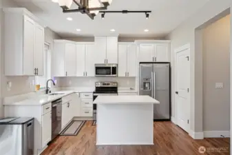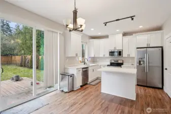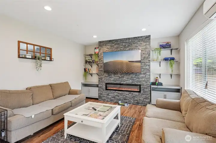 Welcome to this light and bright 4 bed, 2.5 bath home featuring an open-concept main floor designed for everyday living and entertaining. The living room showcases an electric fireplace with a bold rockery surround, creating a striking focal point. The kitchen shines with quartz counters, stainless appliances, shaker cabinets, a pantry, and trendy black hardware. Mini split A/C and heating units provide efficient comfort year-round. Upstairs, the spacious primary suite offers an en suite bath and walk-in closet, along with three additional bedrooms, a full bath, and convenient laundry. Enjoy a fully fenced backyard, attached 2-car garage, and easy access to highways and everyday amenities