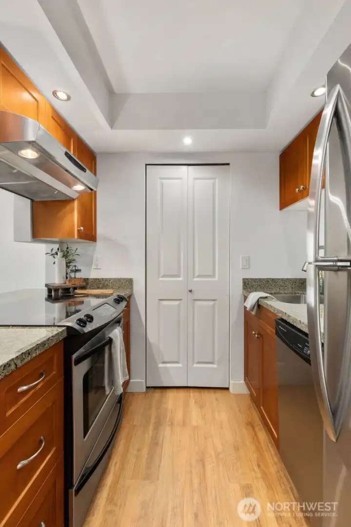 Kitchen has granite countertops and stainless steel appliances