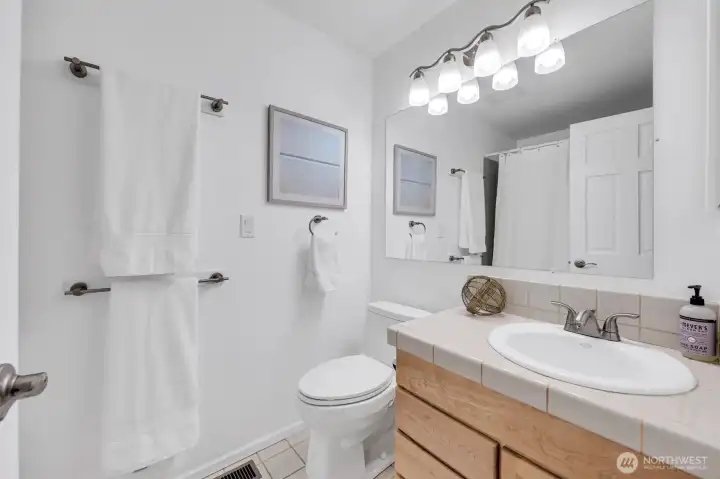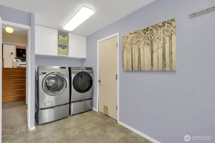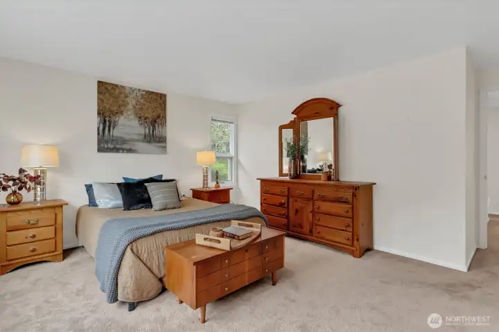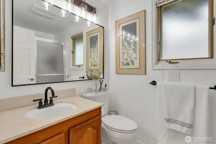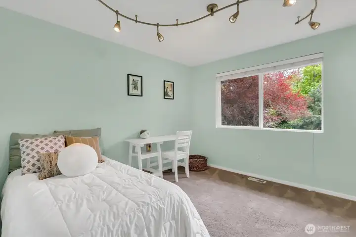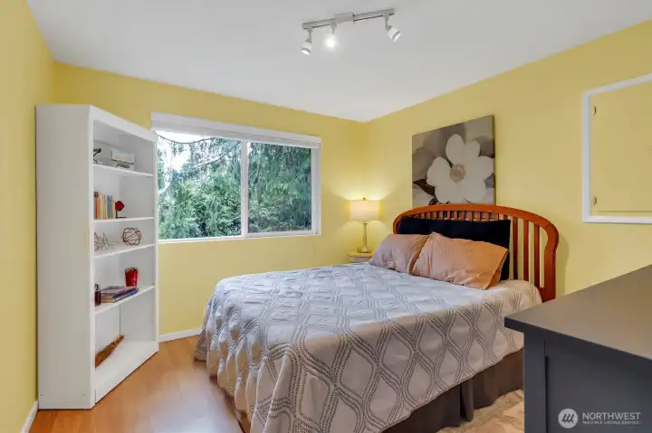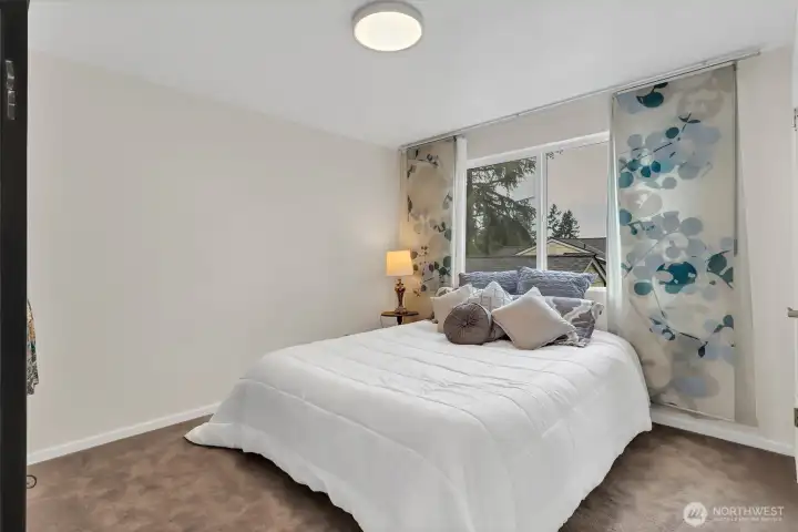 Vaulted ceilings with skylights, floor to ceiling windows and extra lighting makes a cheerful home.