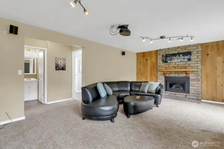 Family room in the basement is a wonderful entertainment space. Built in theater stays. Sliding door to back yard patio.