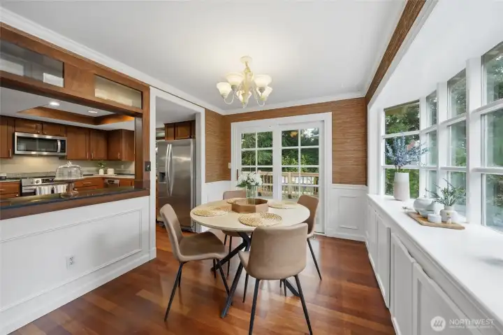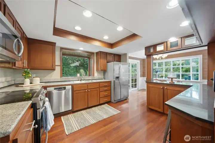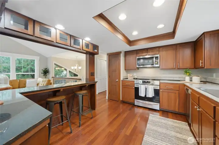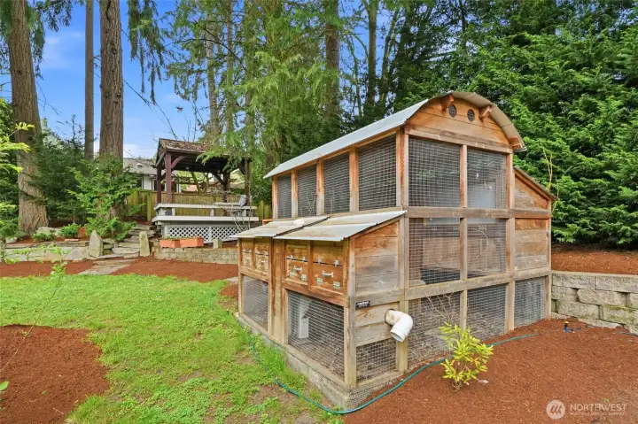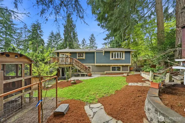Charming Education Hill split-level in the heart of Redmond, rich with character, warmth, and timeless craftsmanship throughout. The inviting kitchen features granite countertops, stainless steel appliances, convection oven and a newly installed oversized sink with thoughtful pass-throughs to the dining and living areas. The result is a bright, connected feel that still maintains defined spaces. Upstairs showcases gorgeous hardwood floors and detailed millwork, including crown molding and chair rails, adding timeless appeal. Recent updates include new attic insulation (2019), heat pump with A/C (2021), new water heater (2026), and fresh interior paint throughout (2026). Step outside to a private backyard retreat with raised garden beds and mature fruit trees, including fig, apple, and plum. Multiple outdoor living spaces — from the detached covered pavilion to the outdoor sauna (2025) — perfect for year-round Pacific Northwest entertaining. The yard also features a thoughtfully built, secure chicken coop with foundation. The lower level offers a refreshed powder room and laundry, new flooring, and flexible space ideal for a home gym, office, or bonus room. Ideally located within an award-winning school district and less than a mile from light rail, shopping, and dining, with easy access to Kirkland, Woodinville, and Bellevue — this is a rare find in one of the Eastside's most connected neighborhoods.