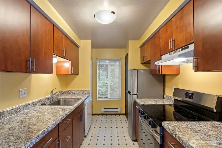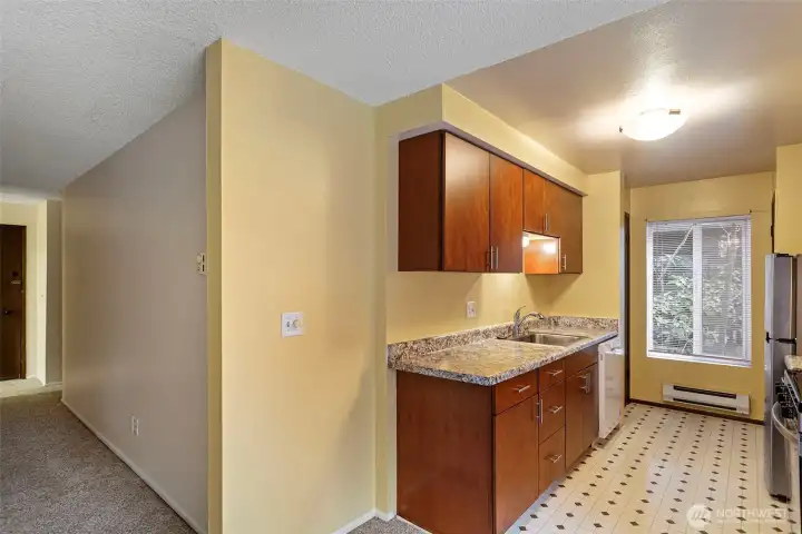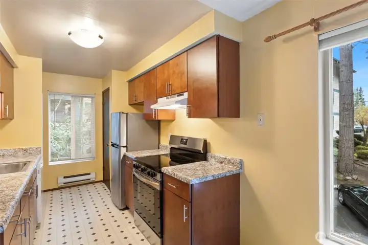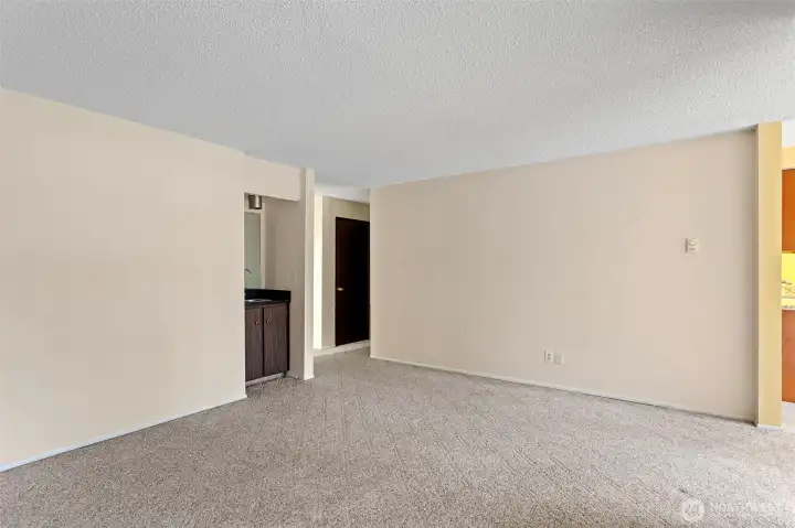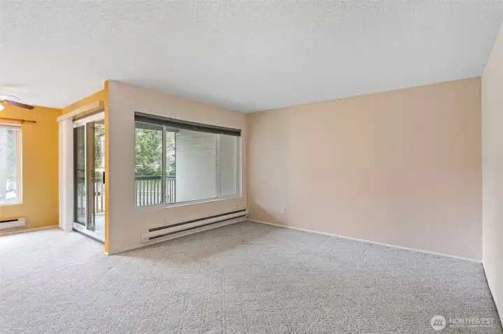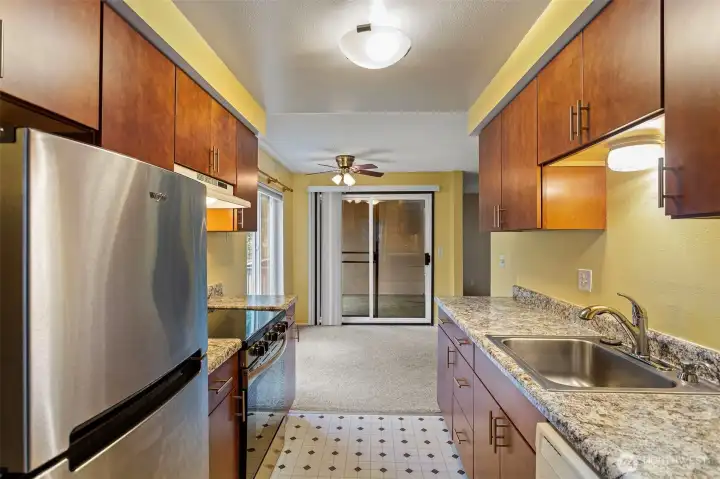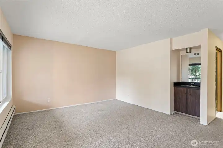 LOCATION! Welcome to this bright and inviting condo featuring a spacious, open-concept living and dining area filled with natural light. Large windows and a sliding glass door create a seamless connection to the outdoors, offering peaceful views and easy access to a private balcony—perfect for relaxing or entertaining. The kitchen is thoughtfully designed with warm wood cabinetry, ample counter space, and modern appliances, making meal prep both functional and enjoyable. Adjacent to the kitchen, the dining area is highlighted by a large window and ceiling fan, creating a comfortable space for everyday living. The generously sized bedroom offers a quiet retreat with plush carpeting and plenty of room to unwind. Neutral tones throughout provide a clean, versatile canvas ready for your personal touch. Additional features include abundant natural light, efficient layout, and a cozy, welcoming atmosphere throughout. Walking distance to the light rail. Conveniently located near shopping, dining, I5/405, and everyday amenities, this home offers both comfort and convenience. Don’t miss the opportunity to make this charming space your own!